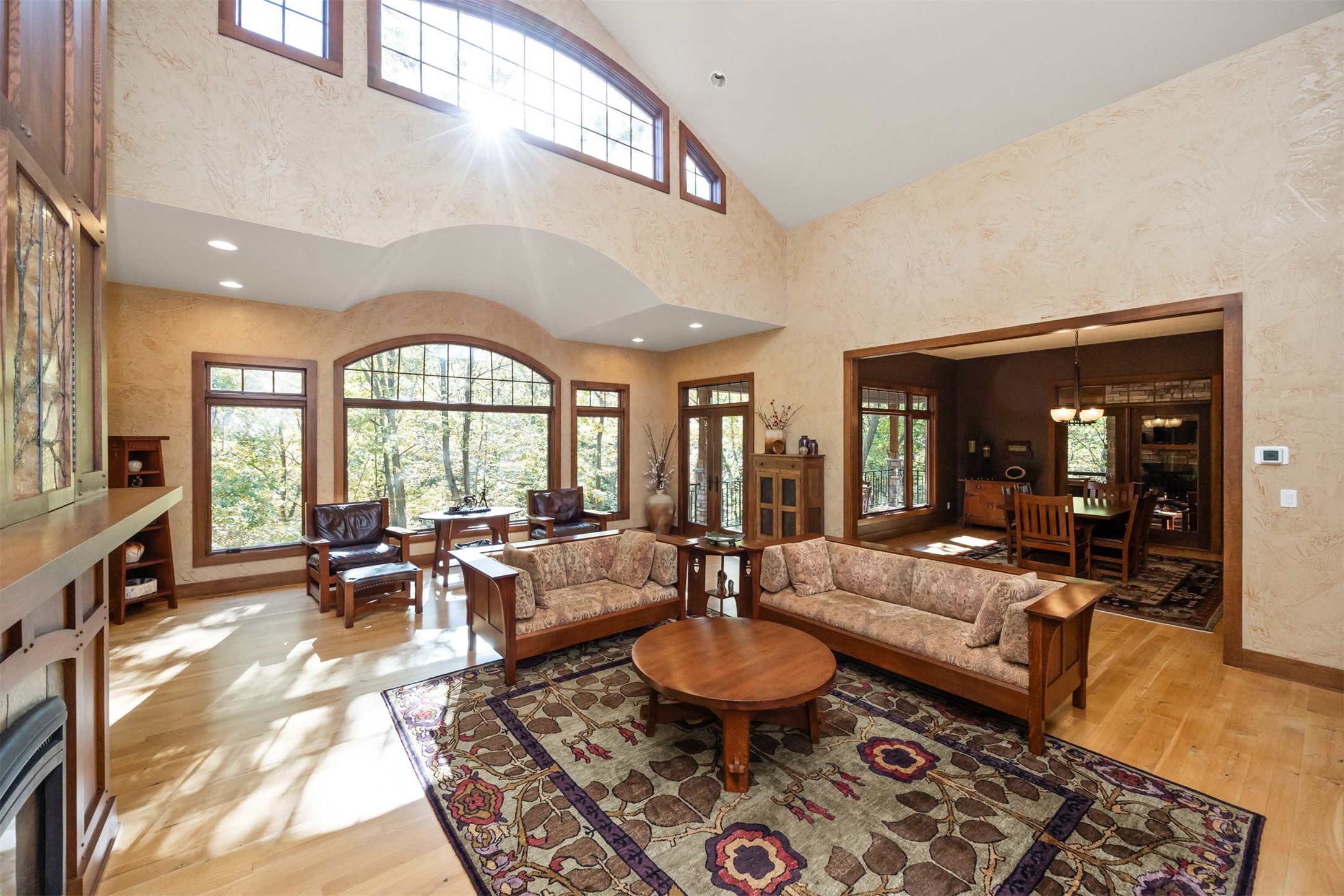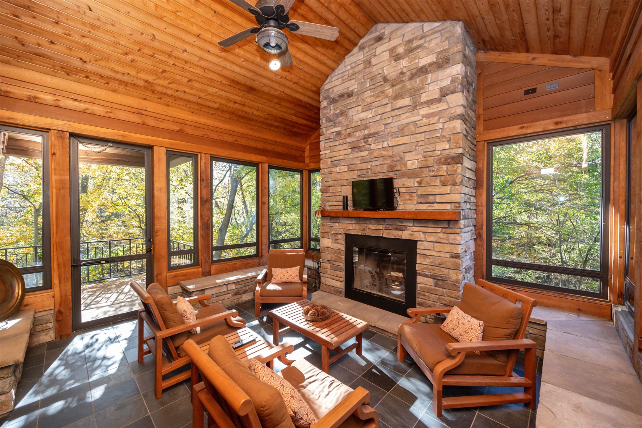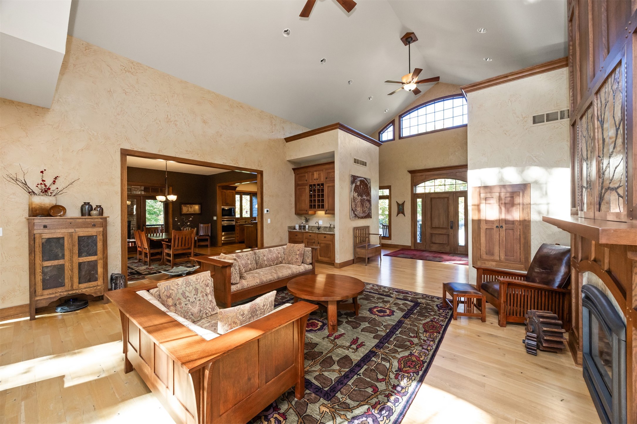 Custom-built by K&V Homes in 2005, this Arts & Crafts-inspired ranch is a true classic-- over 5800 sq ft has been thoughtfully designed with a curved footprint that blends seamlessly into its wooded cul-de-sac setting for ultimate privacy. Quarter-sawn white oak floors, stained glass details, and impeccable craftsmanship carry throughout. The vaulted great room centers on a stunning oak fireplace and built-in bar, perfect for entertaining. The kitchen pairs timeless design with modern efficiency--featuring quarter-sawn oak cabinetry, granite countertops, and a two-tiered island--opening to the dining area and a remarkable 3-season room with insulated tile floors and a floor-to-ceiling stone wood-burning fireplace surrounded by built-in stone benches. The private primary suite offers a serene retreat with sitting area, spa-like bath with jetted tub and tile shower with body sprays, and a spacious walk-in closet. Two main-floor bedrooms share a Jack & Jill bath; a convenient half bath and mudroom/laundry complete this level.. The walkout lower level impresses with hardwood floors, large windows, 2 bedrooms (one ideal as an office), full bath, gym, and workshop. Additional highlights include a 3-car garage plus golf cart bay, new exterior paint (2025), new roof (2019), central vac, zoned HVAC, irrigation, and Pella windows with roll screens--all backing to TCI's lush backdrop of trees and fairways.