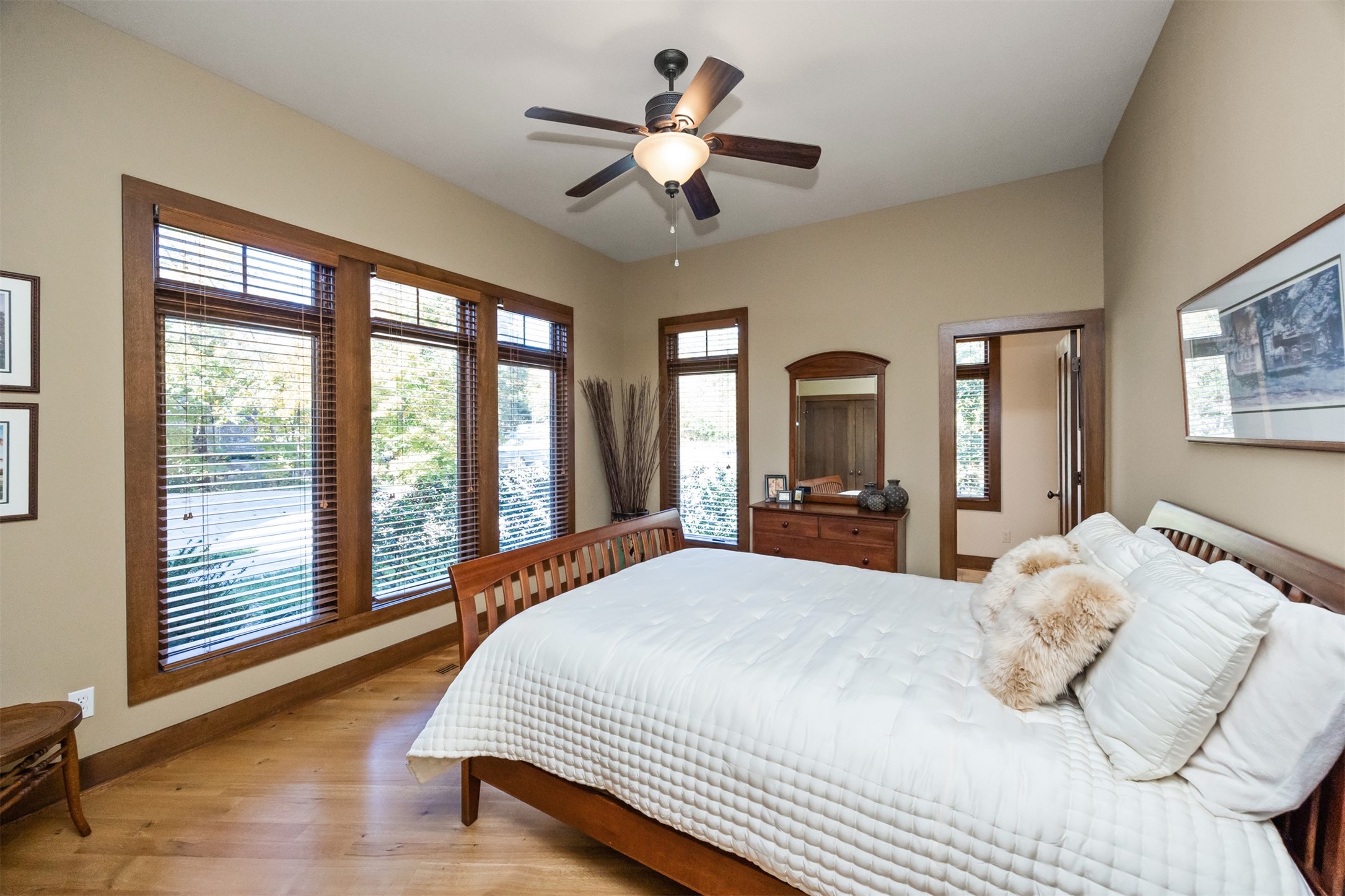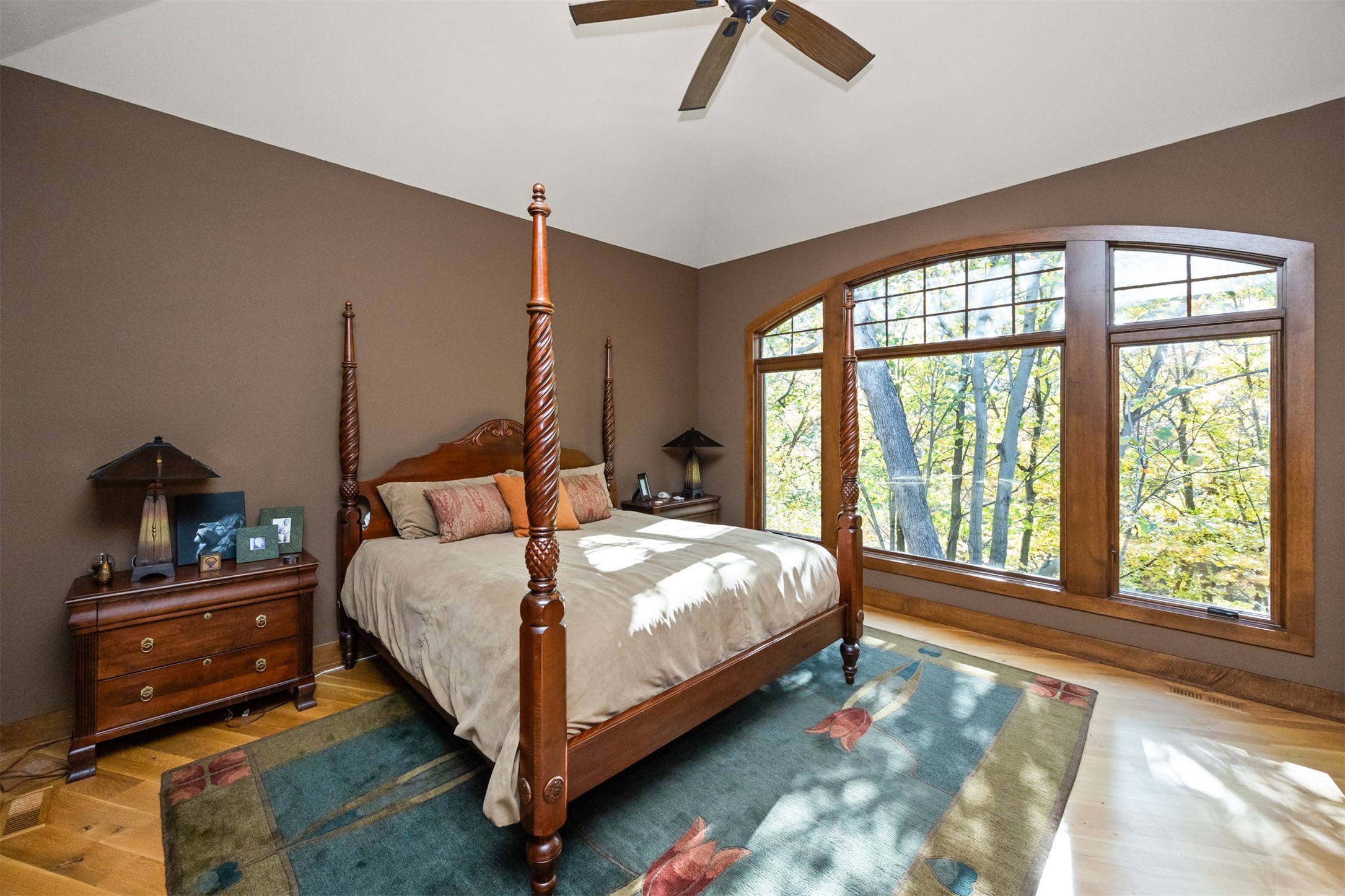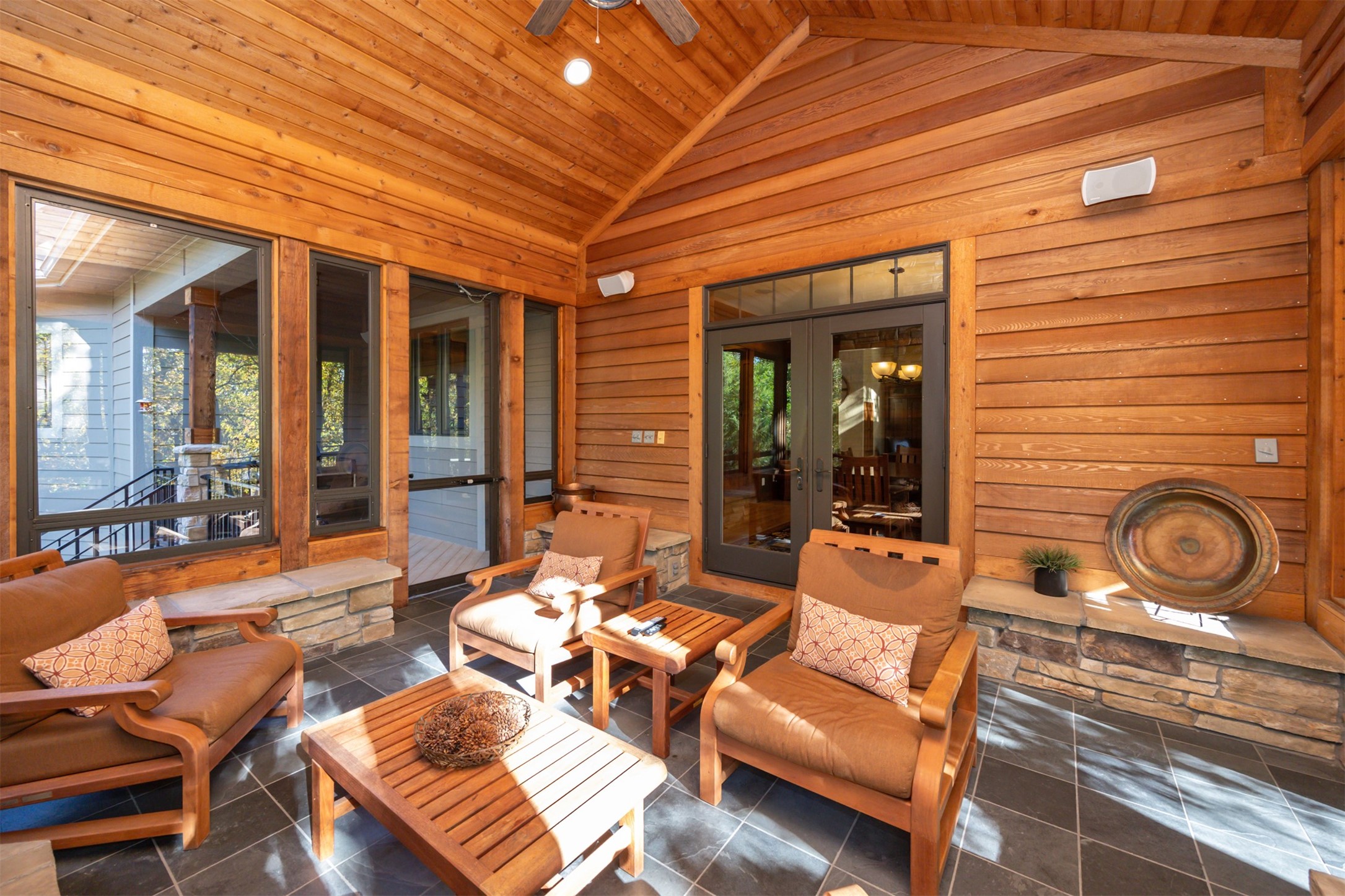 Custom-built by K&V Homes in 2005, this Arts & Crafts-inspired ranch is a true classic-- over 5800 sq ft has been thoughtfully designed with a curved footprint that blends seamlessly into its wooded cul-de-sac setting for ultimate privacy. Quarter-sawn white oak floors, stained glass details, and impeccable craftsmanship carry throughout. The vaulted great room centers on a stunning oak fireplace and built-in bar, perfect for entertaining. The kitchen pairs timeless design with modern efficiency--featuring quarter-sawn oak cabinetry, granite countertops, and a two-tiered island--opening to the dining area and a remarkable 3-season room with insulated tile floors and a floor-to-ceiling stone wood-burning fireplace surrounded by built-in stone benches. The private primary suite offers a serene retreat with sitting area, spa-like bath with jetted tub and tile shower with body sprays, and a spacious walk-in closet. Two main-floor bedrooms share a Jack & Jill bath; a convenient half bath and mudroom/laundry complete this level.. The walkout lower level impresses with hardwood floors, large windows, 2 bedrooms (one ideal as an office), full bath, gym, and workshop. Additional highlights include a 3-car garage plus golf cart bay, new exterior paint (2025), new roof (2019), central vac, zoned HVAC, irrigation, and Pella windows with roll screens--all backing to TCI's lush backdrop of trees and fairways.