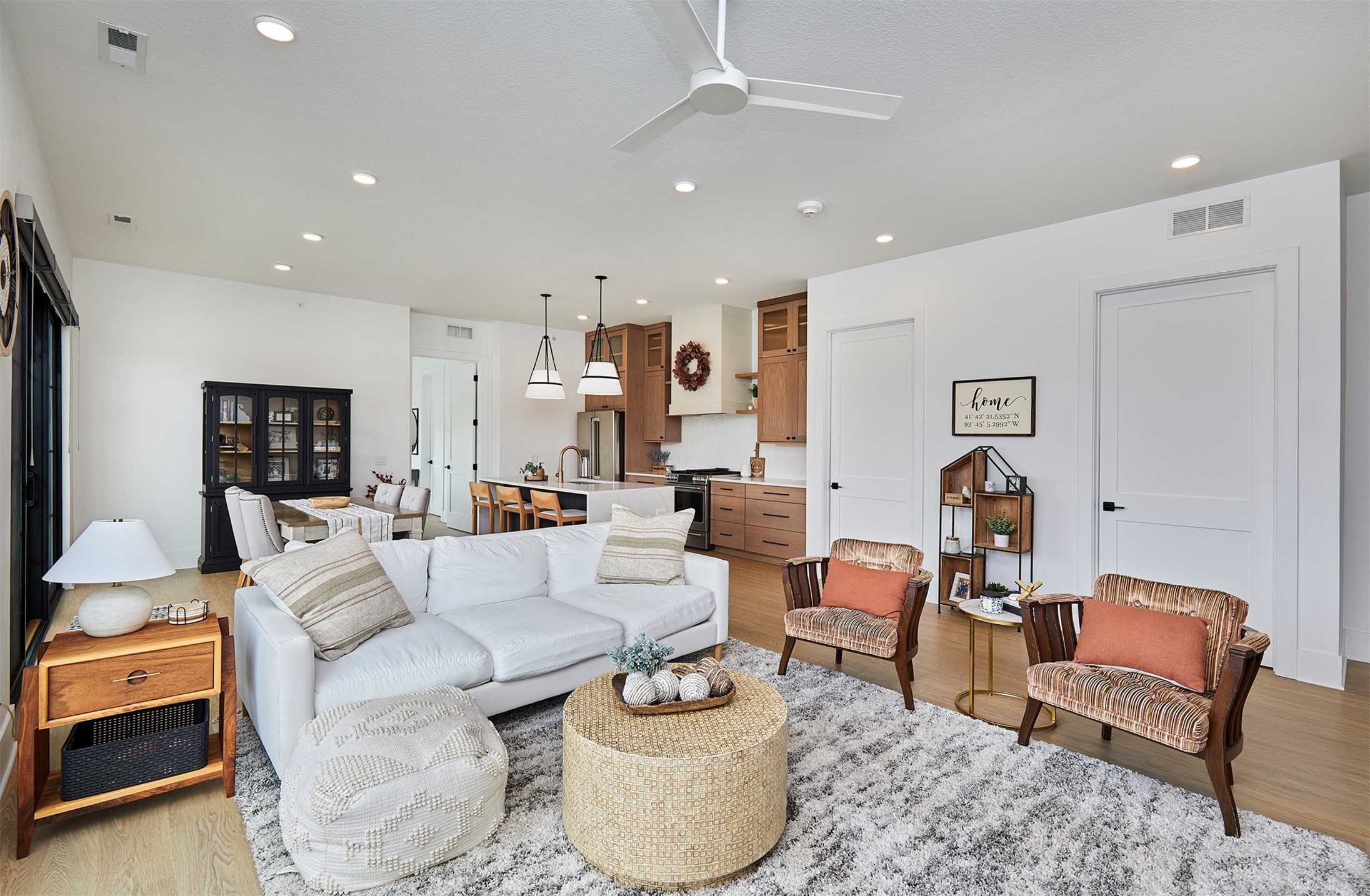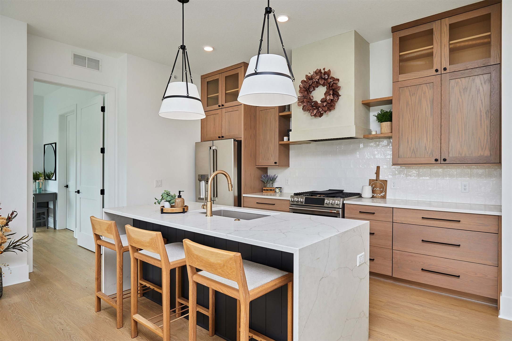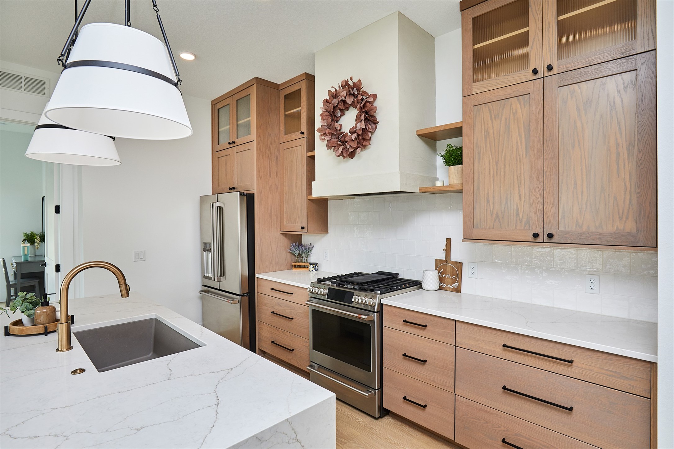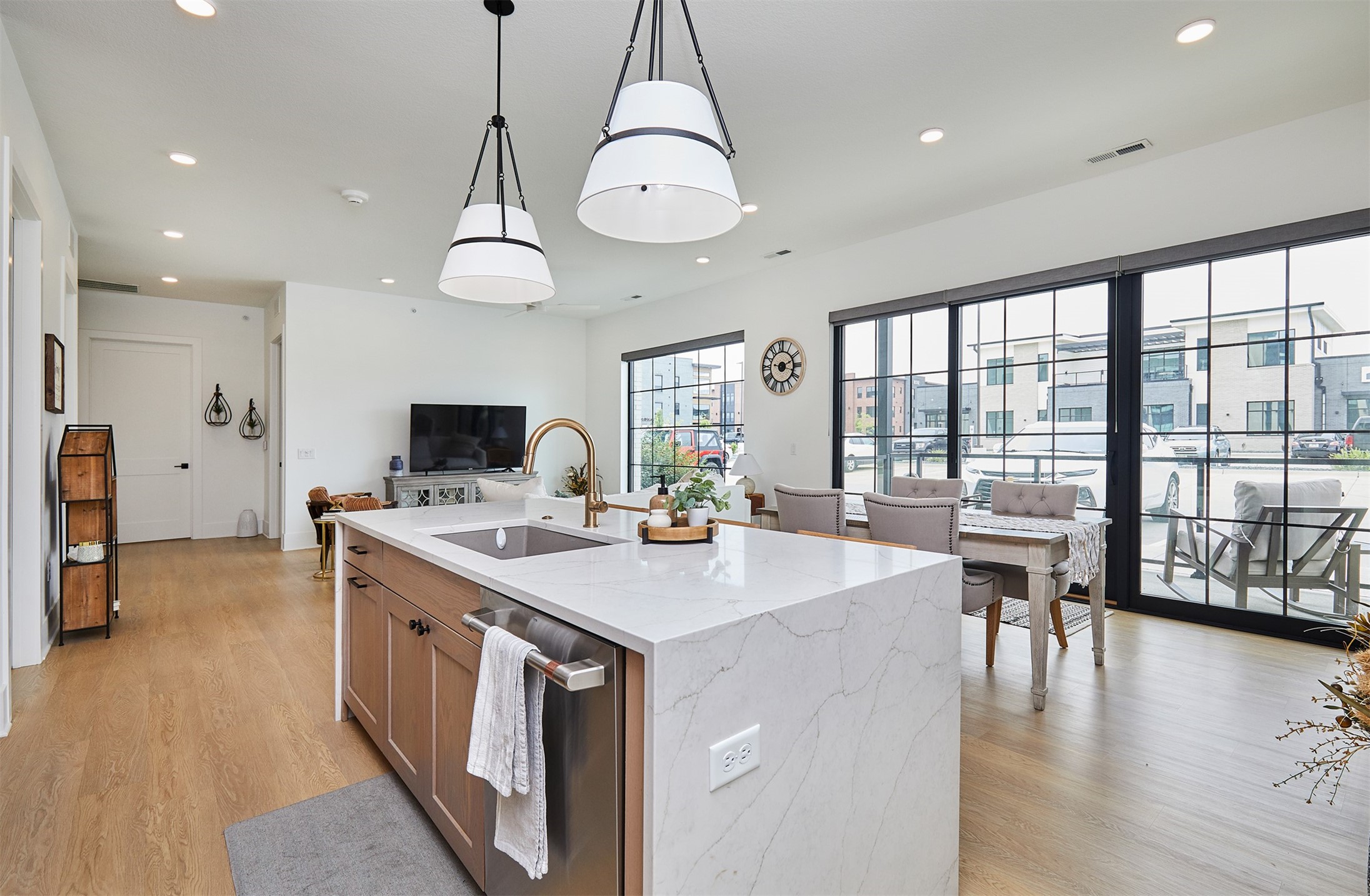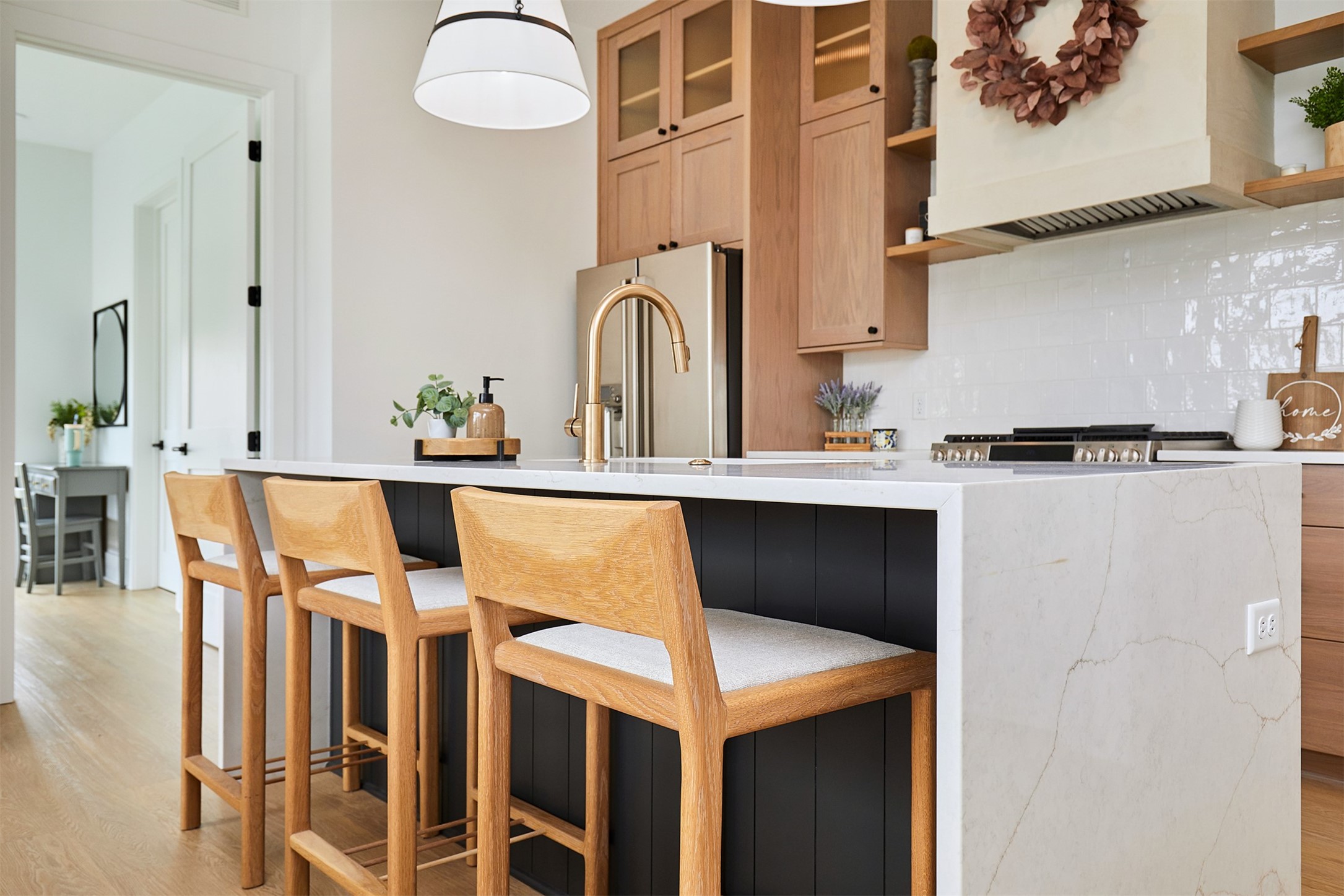 At the heart of the home is a chef's kitchen w/ stunning waterfall-edge quartz counters, tile backsplash, full-height cabinetry, & a generous walk-in pantry. Adjacent dining & living areas provide ample space for relaxed, stylish gatherings.