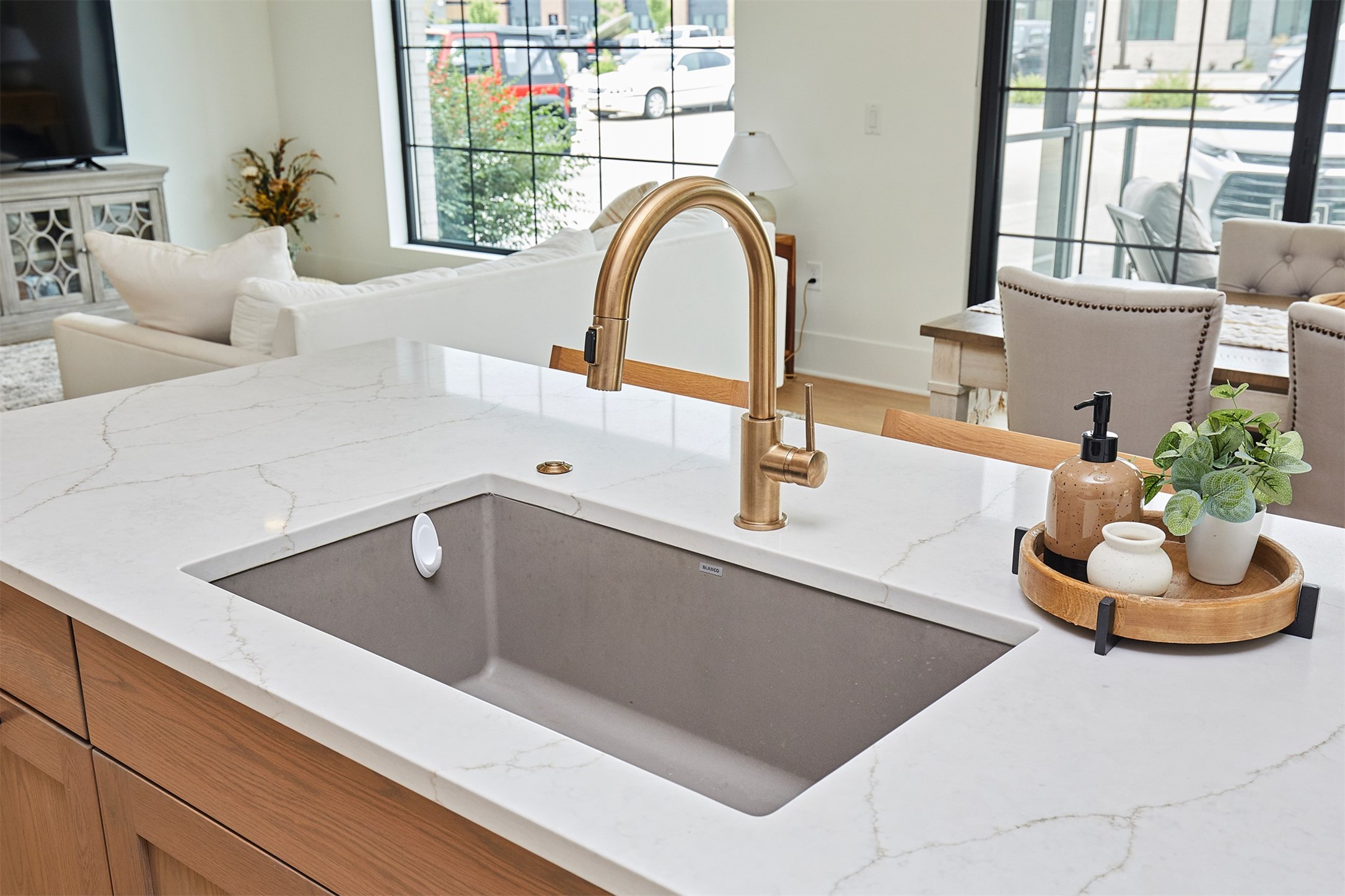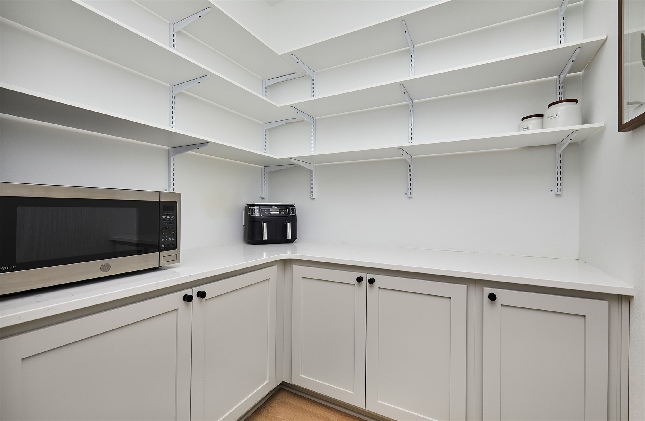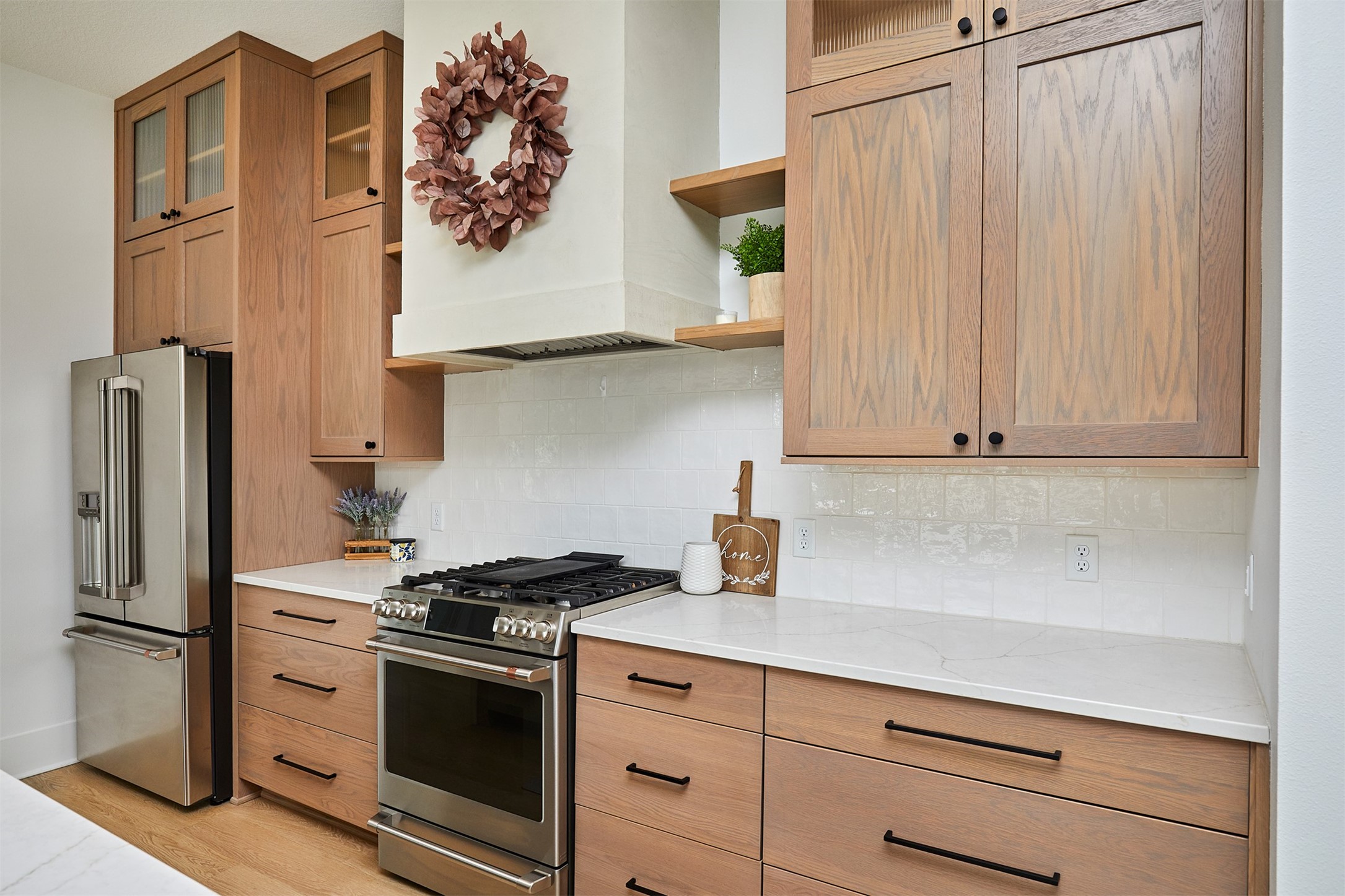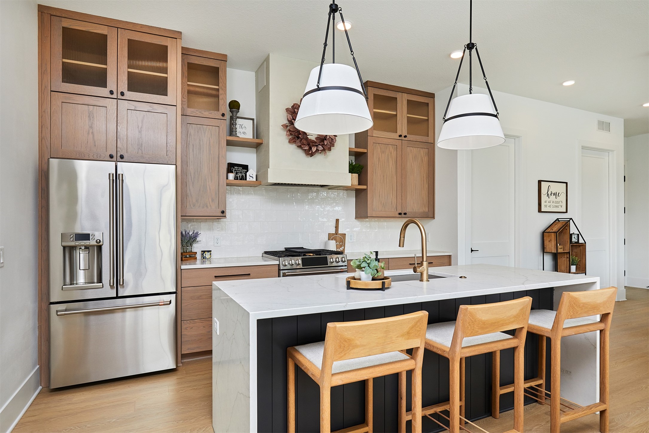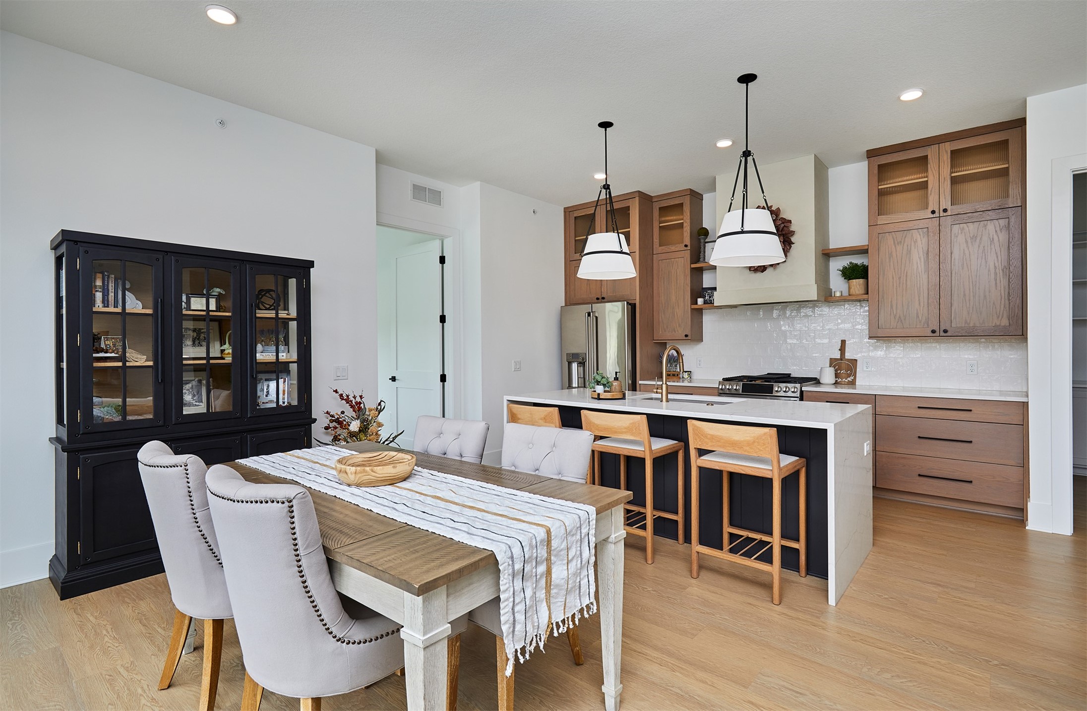 At the heart of the home is a chef's kitchen w/ stunning waterfall-edge quartz counters, tile backsplash, full-height cabinetry, & a generous walk-in pantry. Adjacent dining & living areas provide ample space for relaxed, stylish gatherings.
