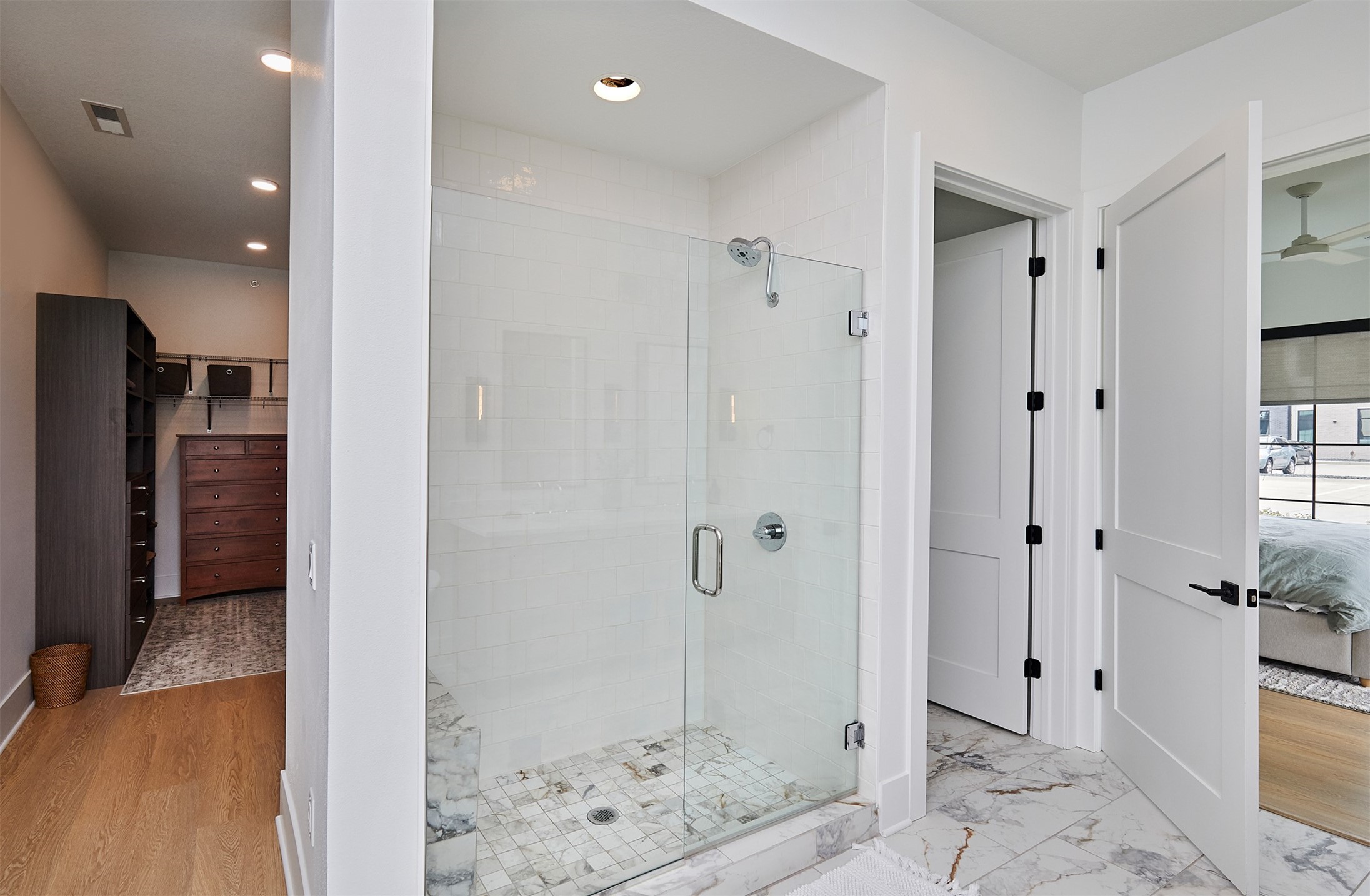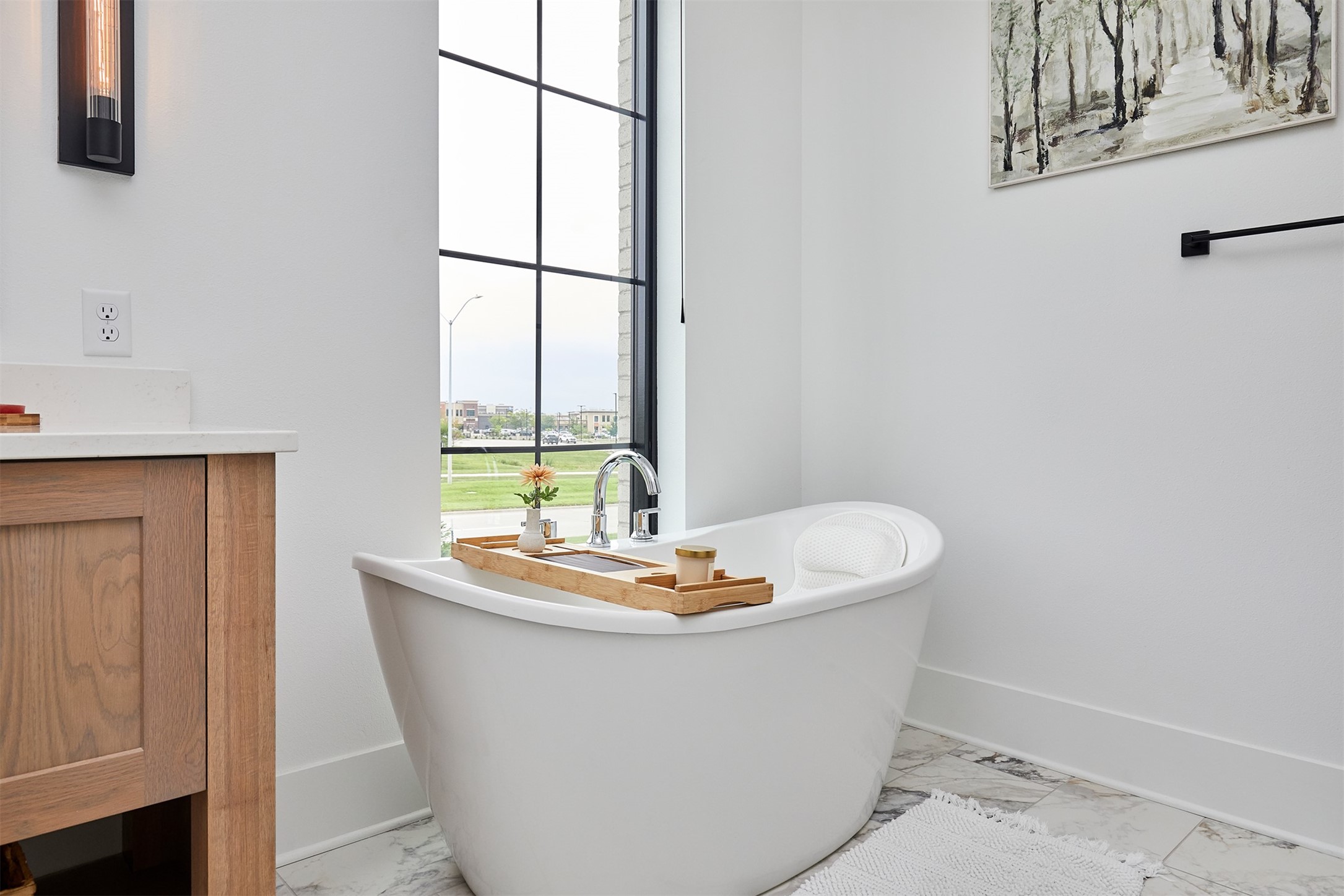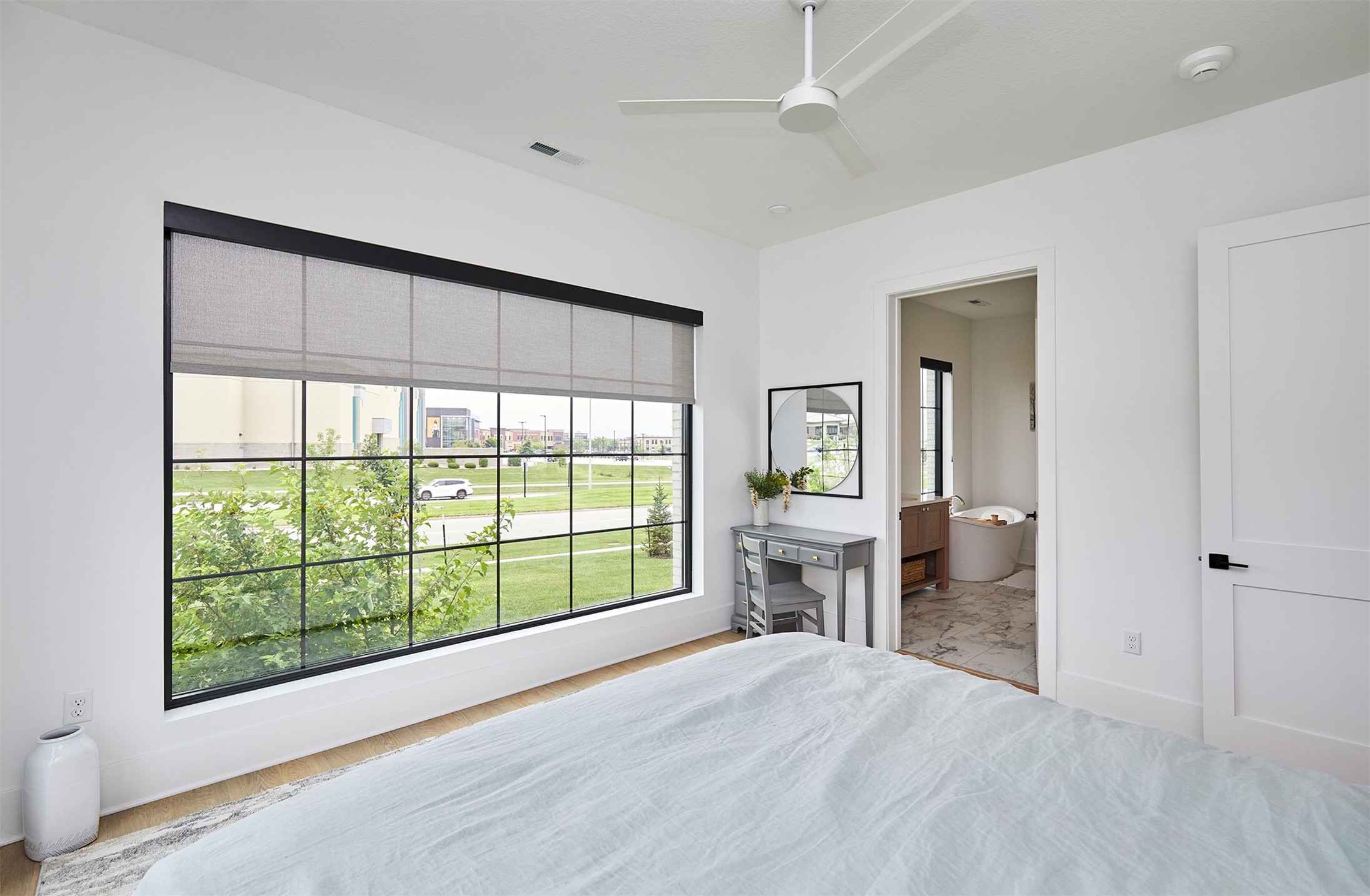 The owner's suite is a true retreat, featuring a spa-inspired tile shower, large soaker tub, & spacious walk-in closet. The shaded blinds throughout filter light while preserving privacy--so you can enjoy the view without being seen from outside.