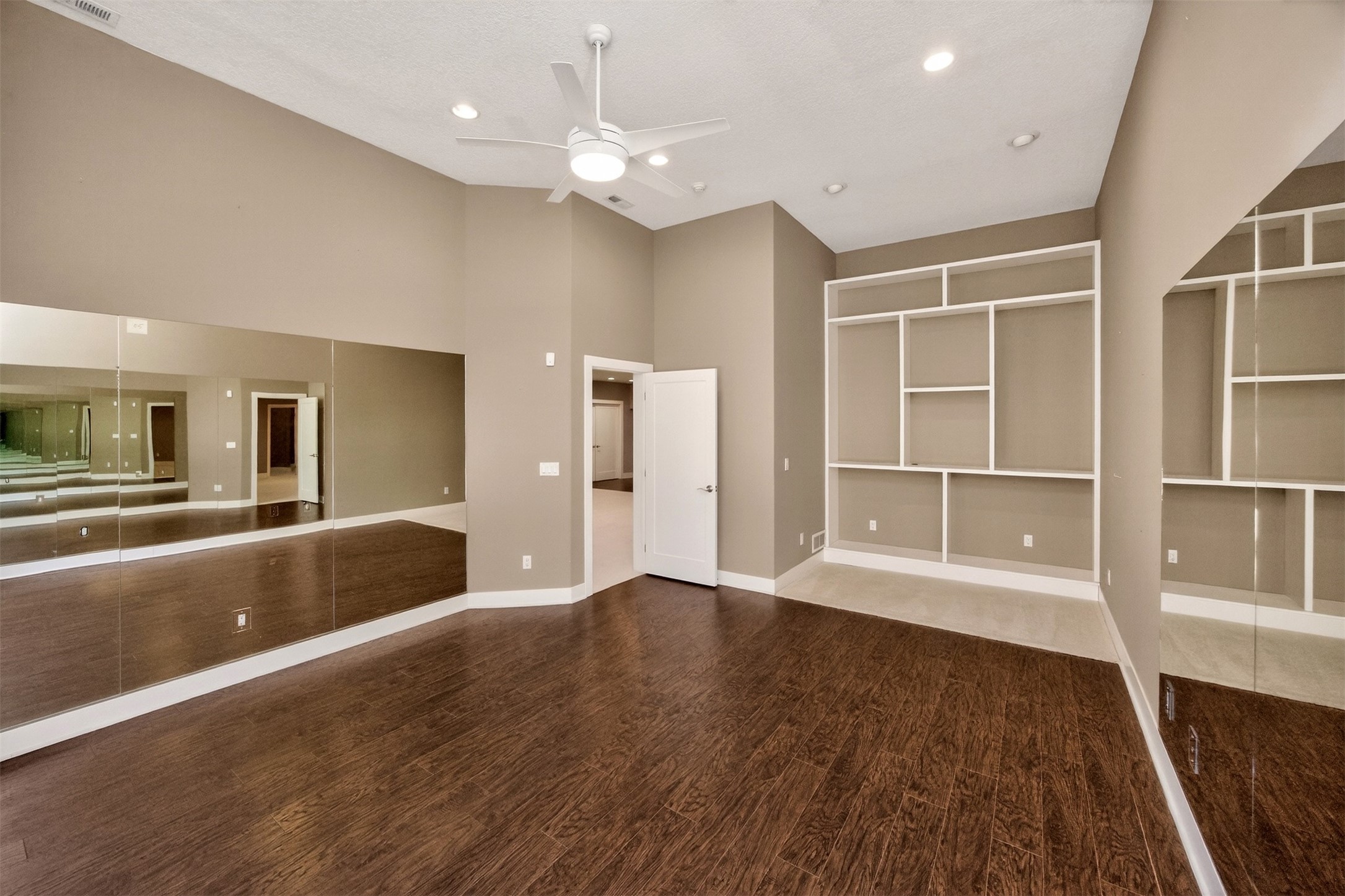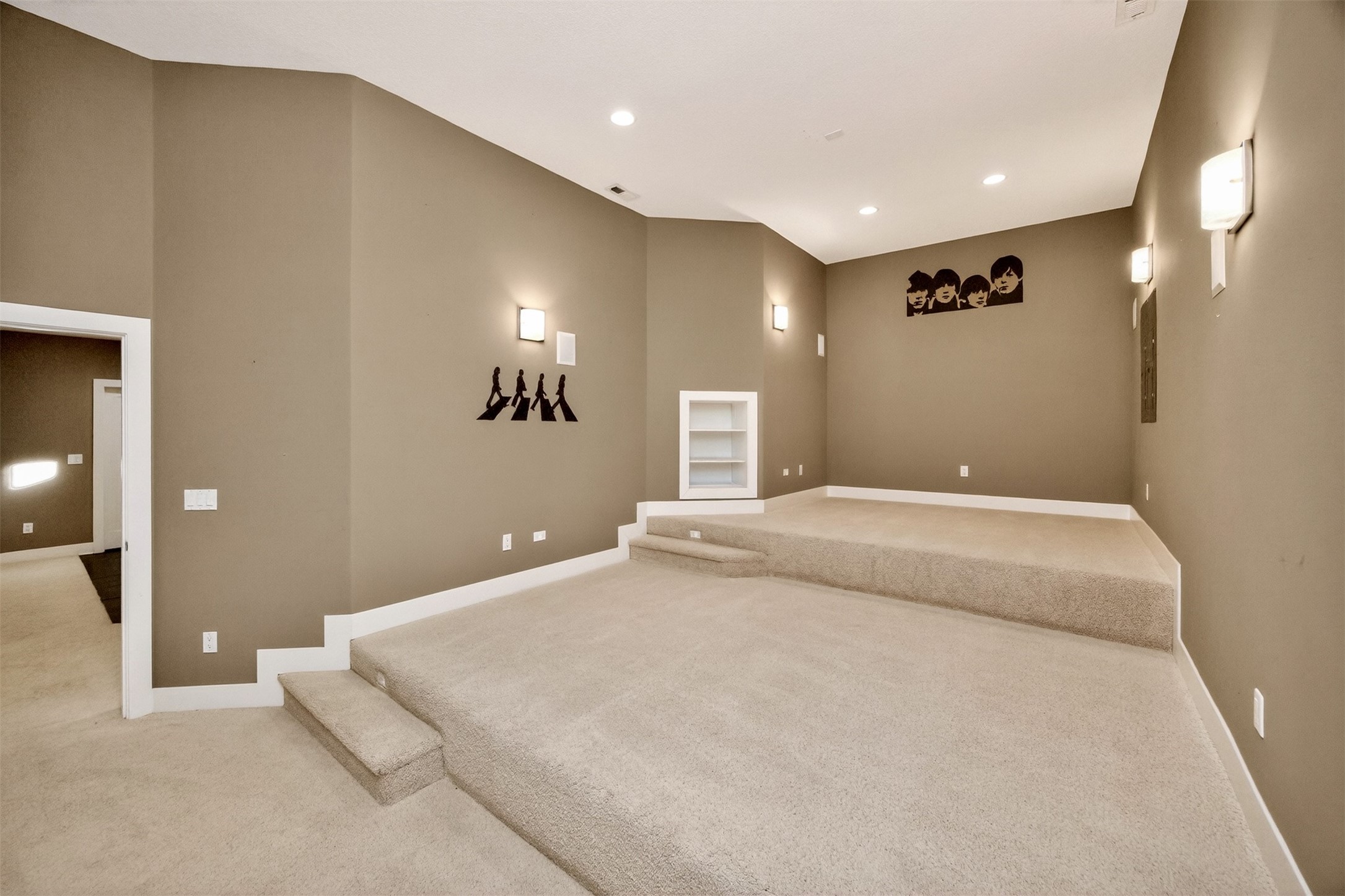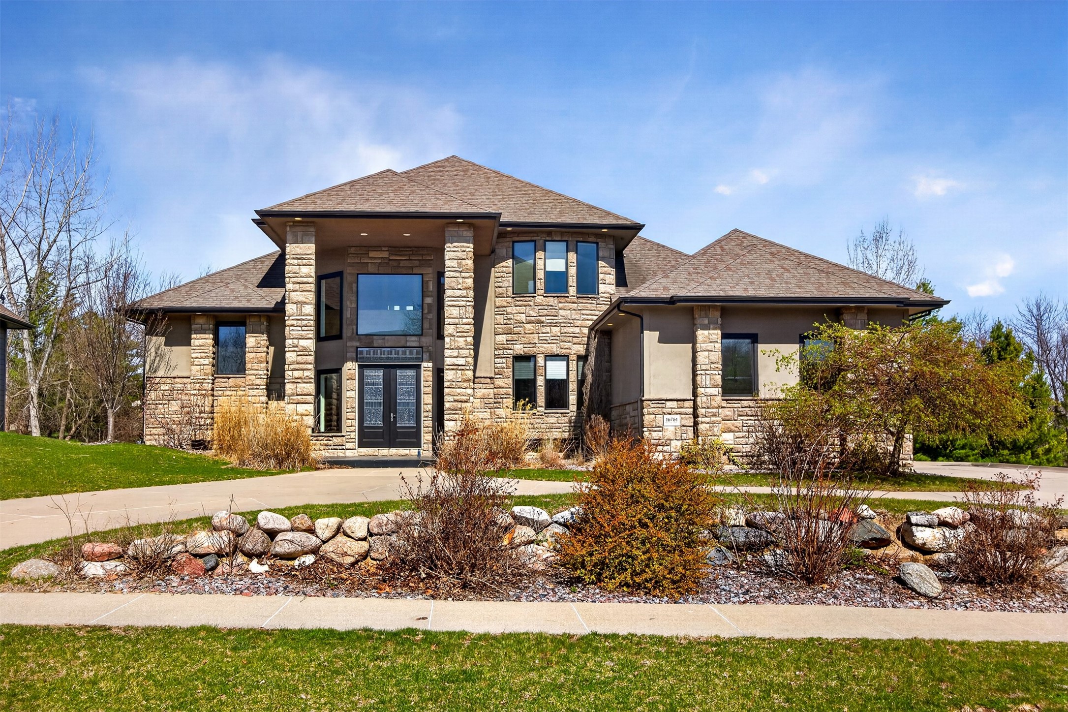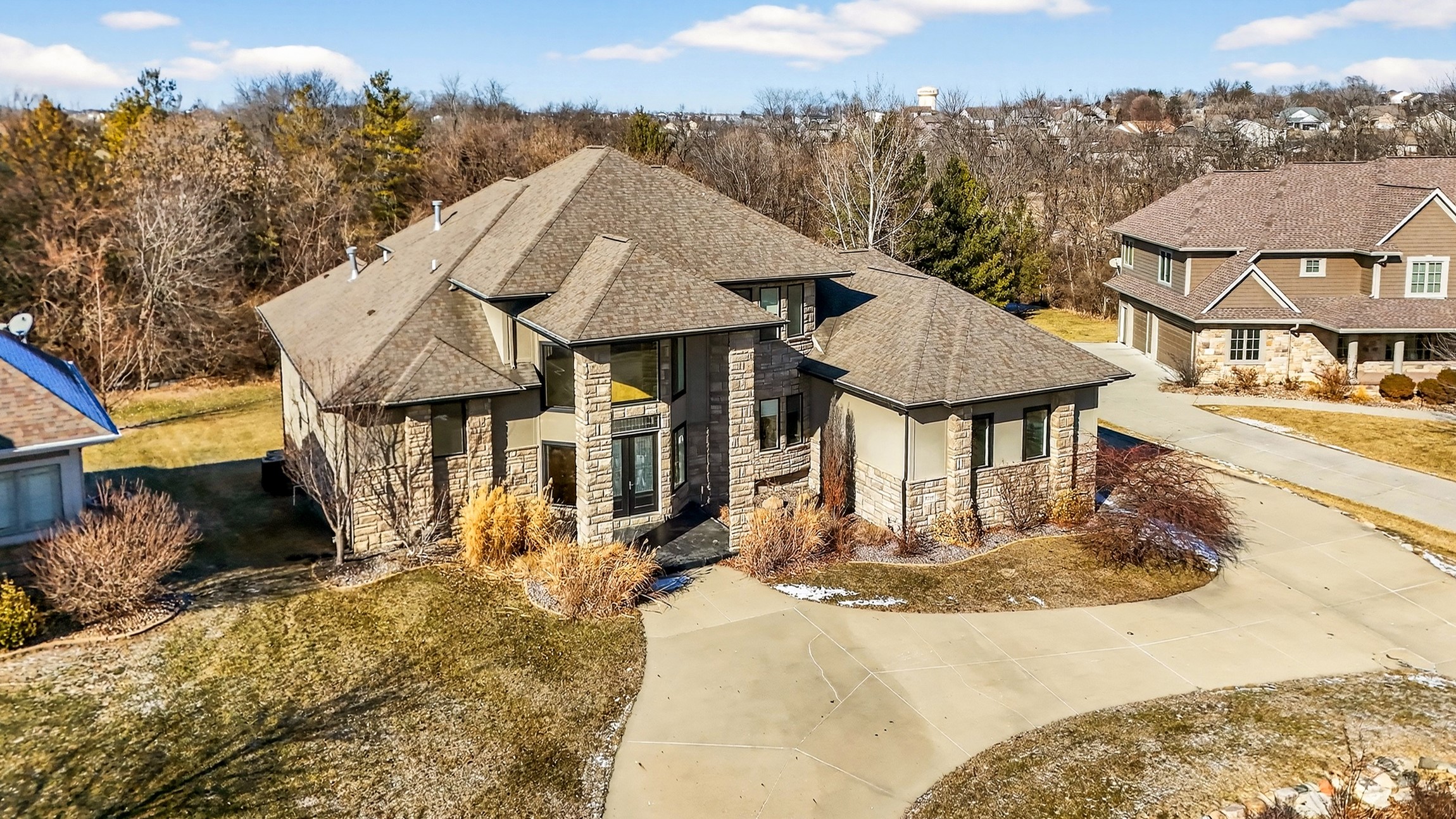 The walkout lower level expands the home's versatility with a built-in bar, theater room, gym, additional bedroom, two full baths, and a walk-in closet, plus access to the patio. Oversized three-car garage with storage and a rare half-circle driveway provide ample parking.