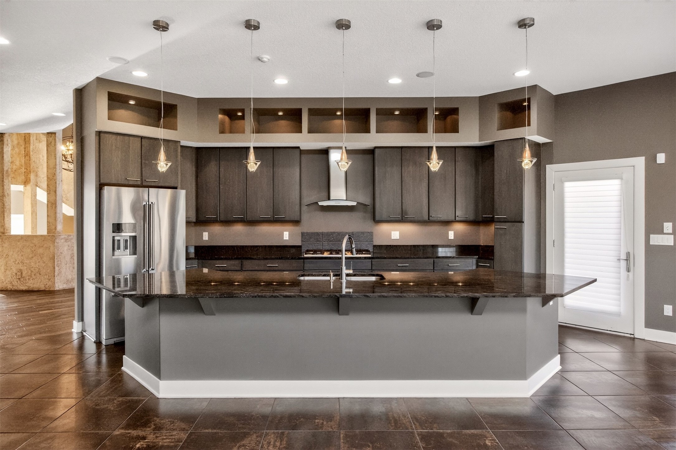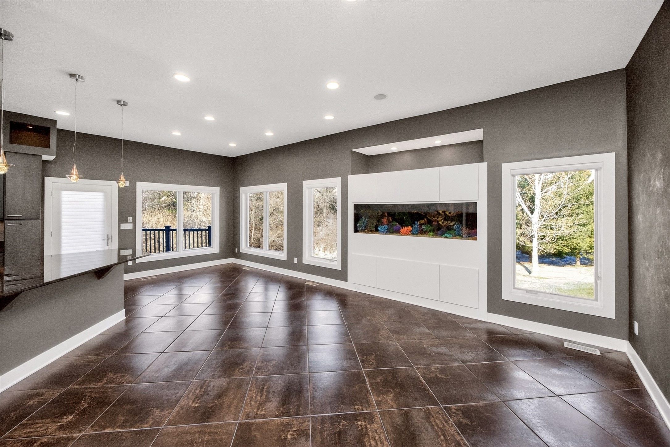 A soaring two-story great room features a statement stone fireplace and a wall of built-in niches. The kitchen is both stylish and functional, offering abundant cabinetry, generous prep space, and a unique built-in aquarium ready to be reimagined for creative use. An expansive dining area opens directly to the outdoor deck, ideal for everyday living and entertaining.