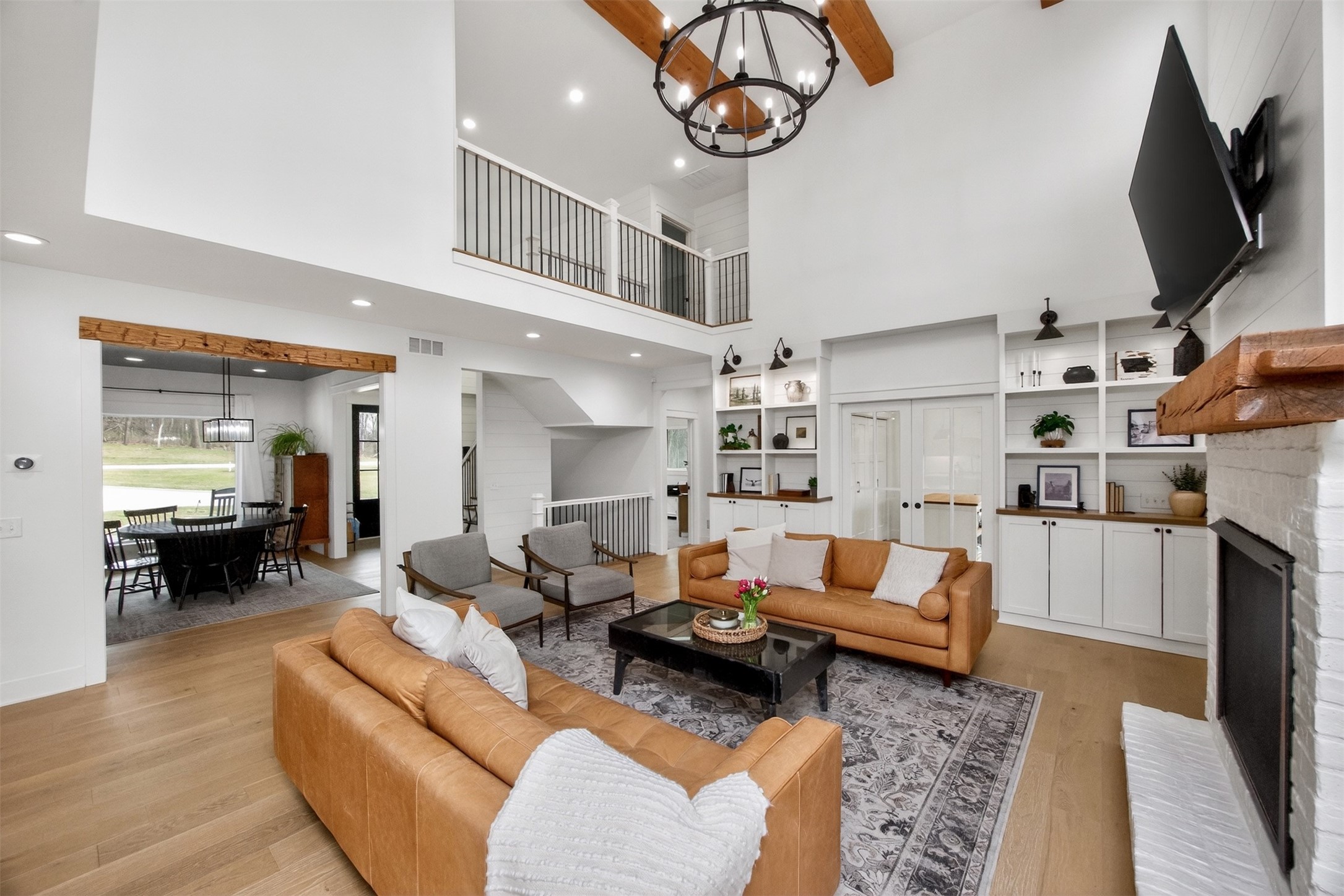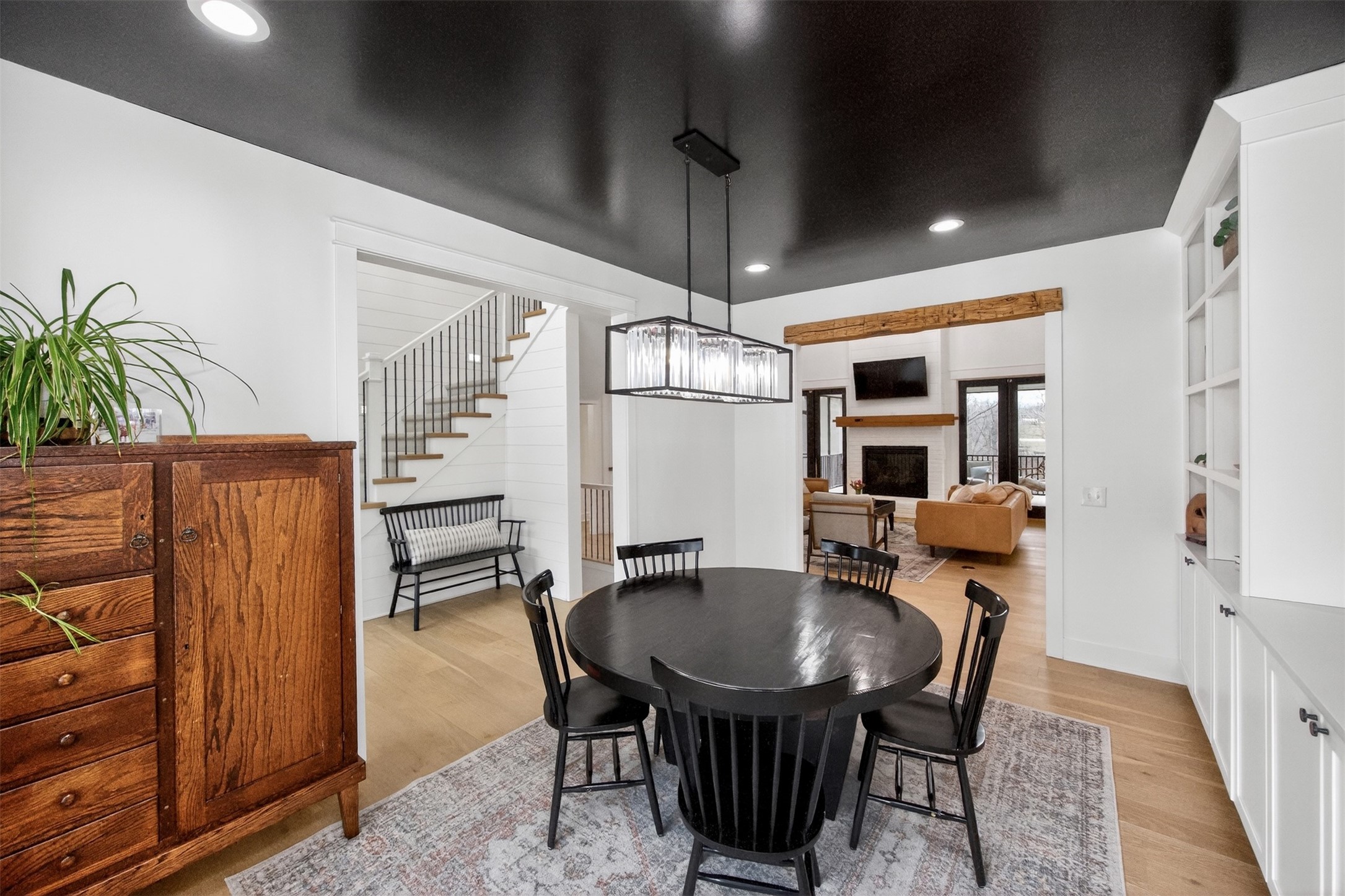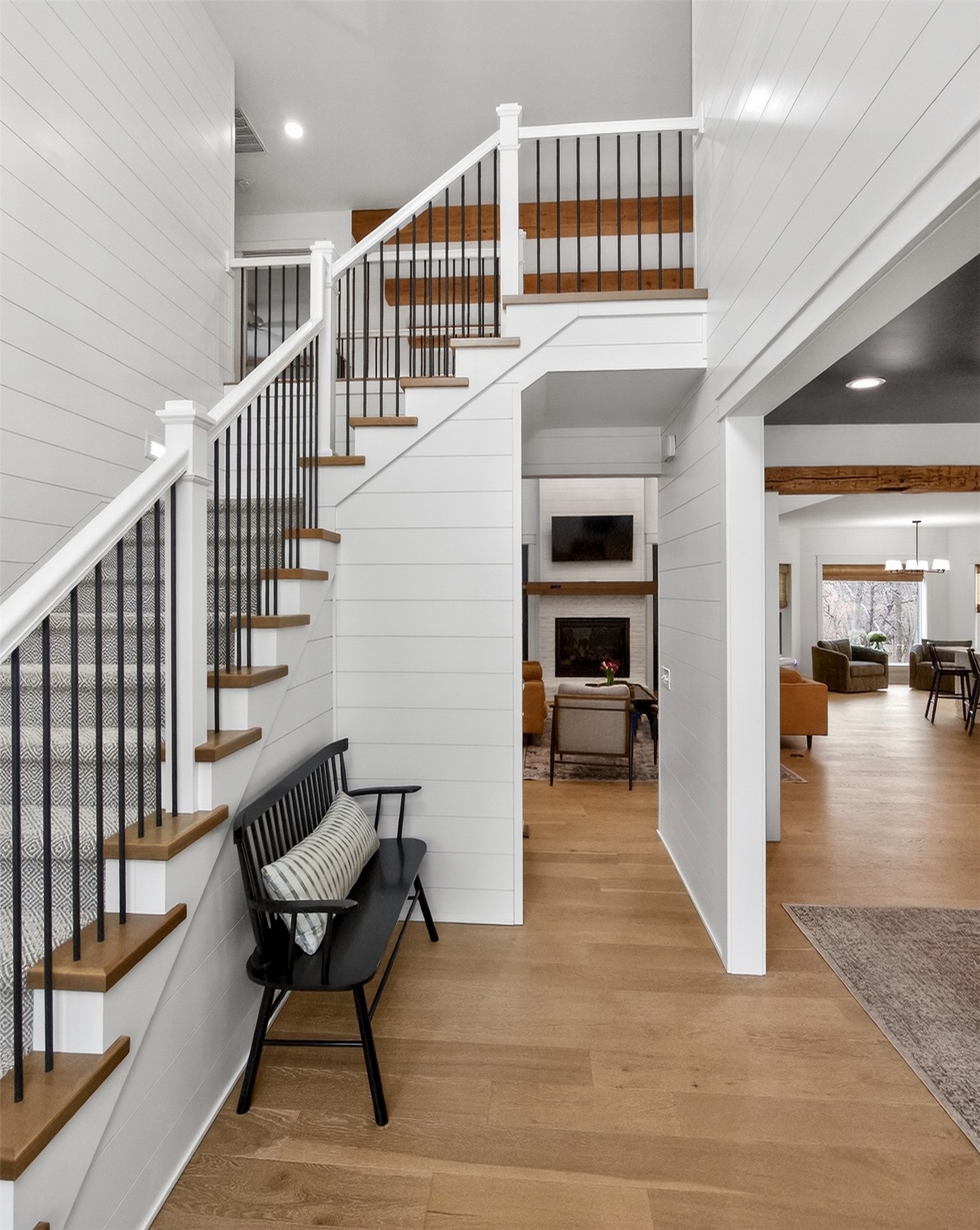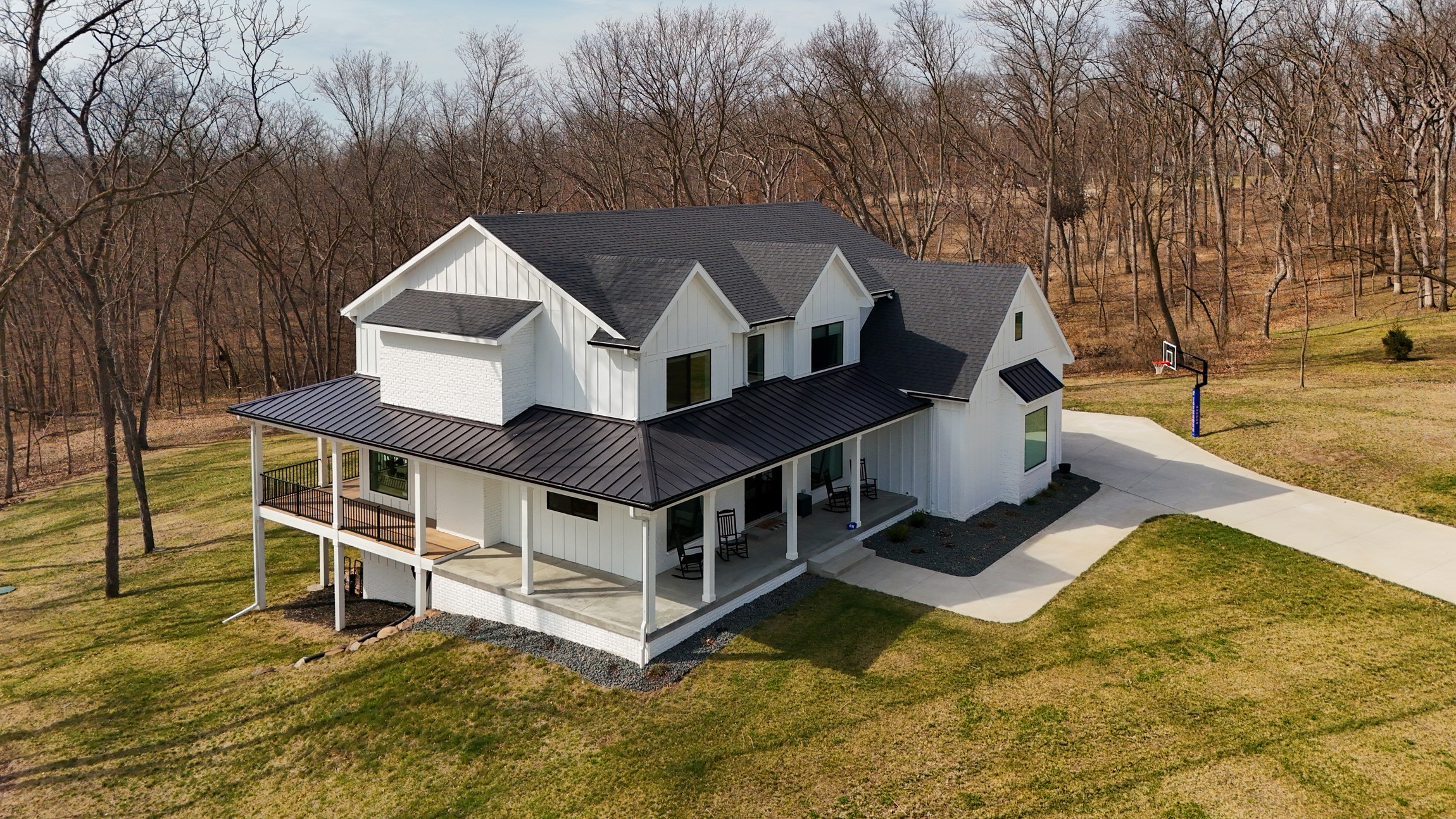 Exceptional Design, Unmatched Detail - Immaculate 6 bed, 5 bath custom 2-story in River Woods, located in the highly sought-after Van Meter school district with easy access to WDM and Waukee amenities. This thoughtfully designed home showcases white oak engineered hardwood floors, soaring 20 ft ceilings, shiplap accents, and locally sourced wood beams. The main level offers a private office/den, bonus bedroom/flex space, 3/4 bath, and a welcoming family room that opens to a stunning kitchen with stainless steel appliances, quartz counters, oversized island, under-cabinet lighting, and a walk-in pantry with grocery door. A cozy sitting area with a pocket bar and beverage fridge adds the perfect touch. Dining is an event with the statement ceiling and custom built-ins! Enjoy the screened porch year-round with infrared heaters and peaceful views. Upstairs features a spacious primary suite with a cozy sitting area, soaking tub, heated tiled shower, dual walk-in closets, and convenient laundry plus 3 add'l bedrooms, including a Jack & Jill bath and an ensuite 3/4 bath. A catwalk overlooks the main level. The walkout lower level provides additional living space, a bedroom, full bath, and abundant storage w/ storm shelter space. The heated garage is oversized for all needs and hobbies! Situated on 2.13 flat acres with mature trees, a wraparound porch, and patio--this home blends privacy, luxury, comfort, and function in a serene setting.