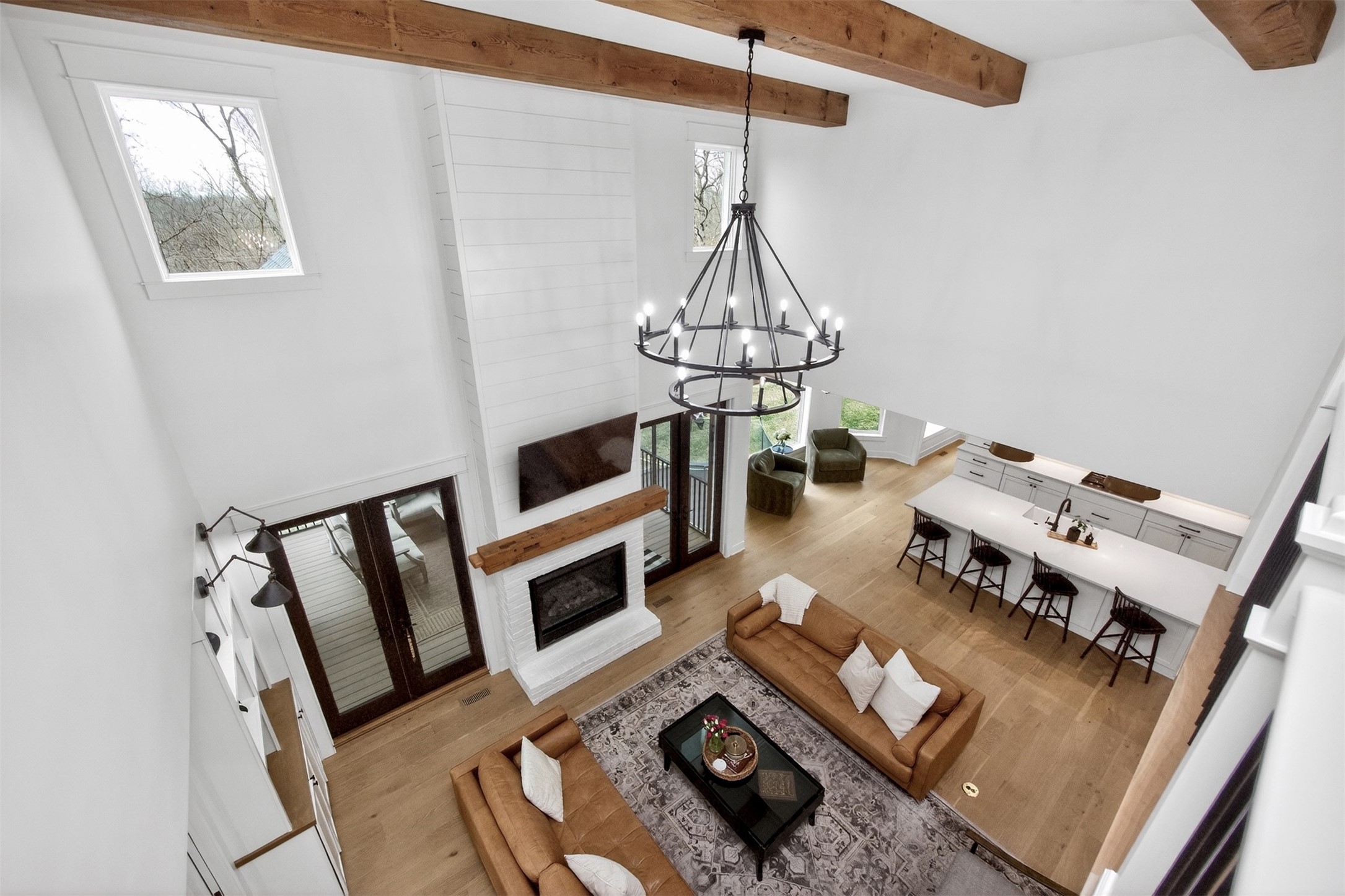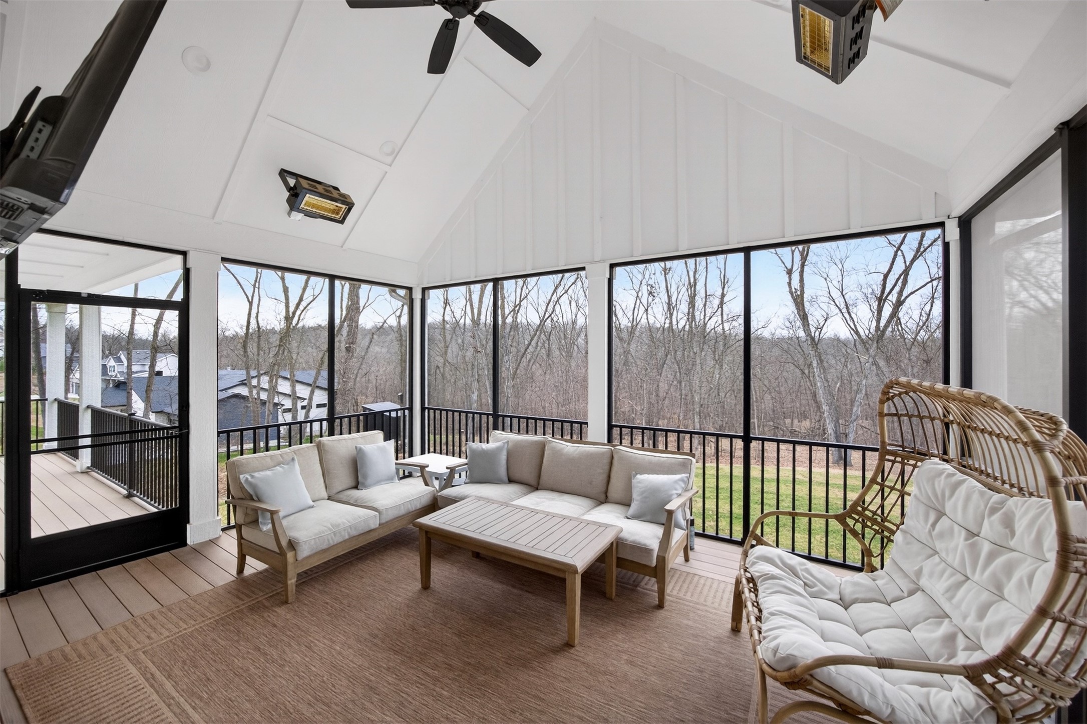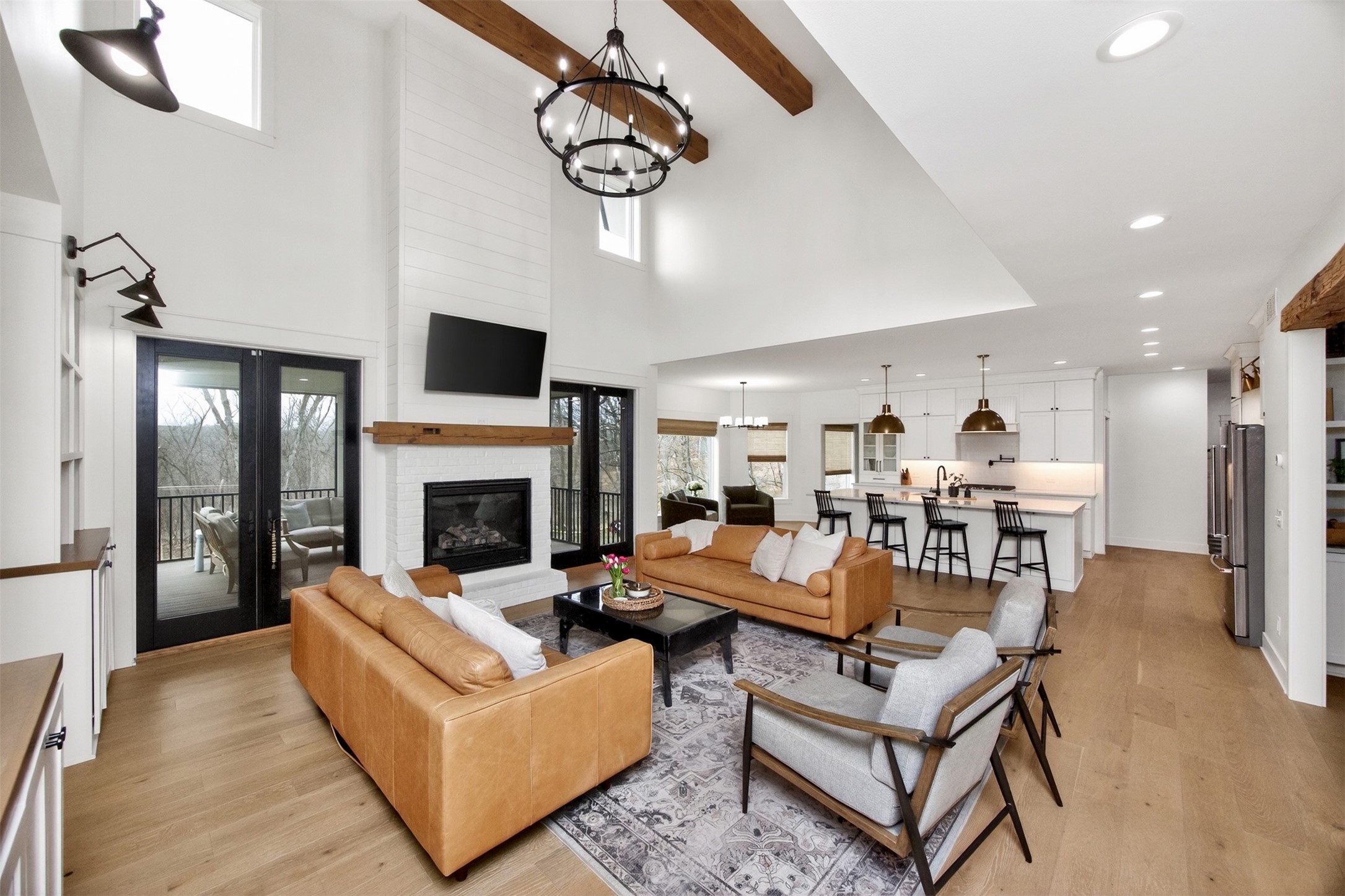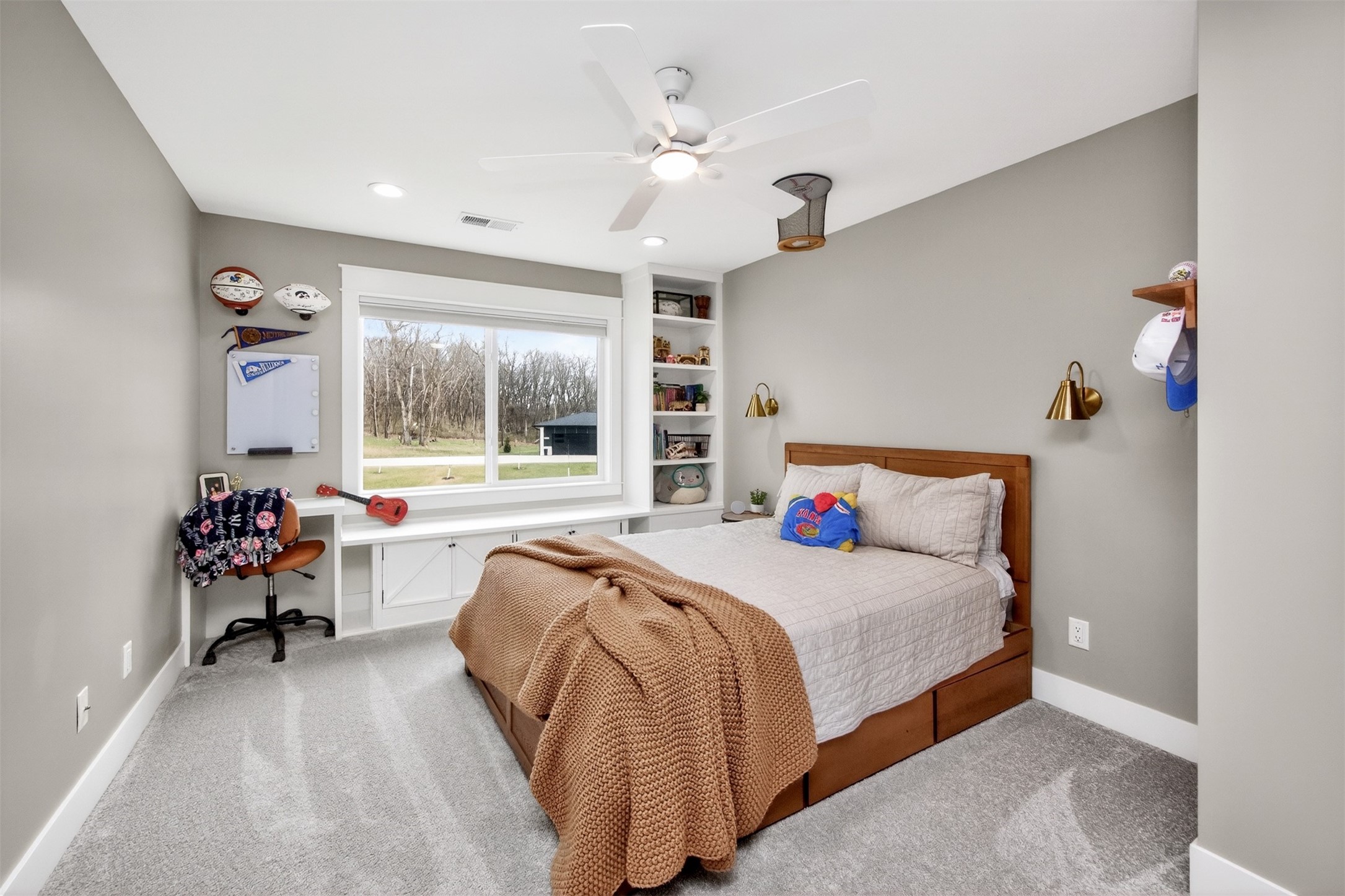 Exceptional Design, Unmatched Detail - Immaculate 6 bed, 5 bath custom 2-story in River Woods, located in the highly sought-after Van Meter school district with easy access to WDM and Waukee amenities. This thoughtfully designed home showcases white oak engineered hardwood floors, soaring 20 ft ceilings, shiplap accents, and locally sourced wood beams. The main level offers a private office/den, bonus bedroom/flex space, 3/4 bath, and a welcoming family room that opens to a stunning kitchen with stainless steel appliances, quartz counters, oversized island, under-cabinet lighting, and a walk-in pantry with grocery door. A cozy sitting area with a pocket bar and beverage fridge adds the perfect touch. Dining is an event with the statement ceiling and custom built-ins! Enjoy the screened porch year-round with infrared heaters and peaceful views. Upstairs features a spacious primary suite with a cozy sitting area, soaking tub, heated tiled shower, dual walk-in closets, and convenient laundry plus 3 add'l bedrooms, including a Jack & Jill bath and an ensuite 3/4 bath. A catwalk overlooks the main level. The walkout lower level provides additional living space, a bedroom, full bath, and abundant storage w/ storm shelter space. The heated garage is oversized for all needs and hobbies! Situated on 2.13 flat acres with mature trees, a wraparound porch, and patio--this home blends privacy, luxury, comfort, and function in a serene setting.