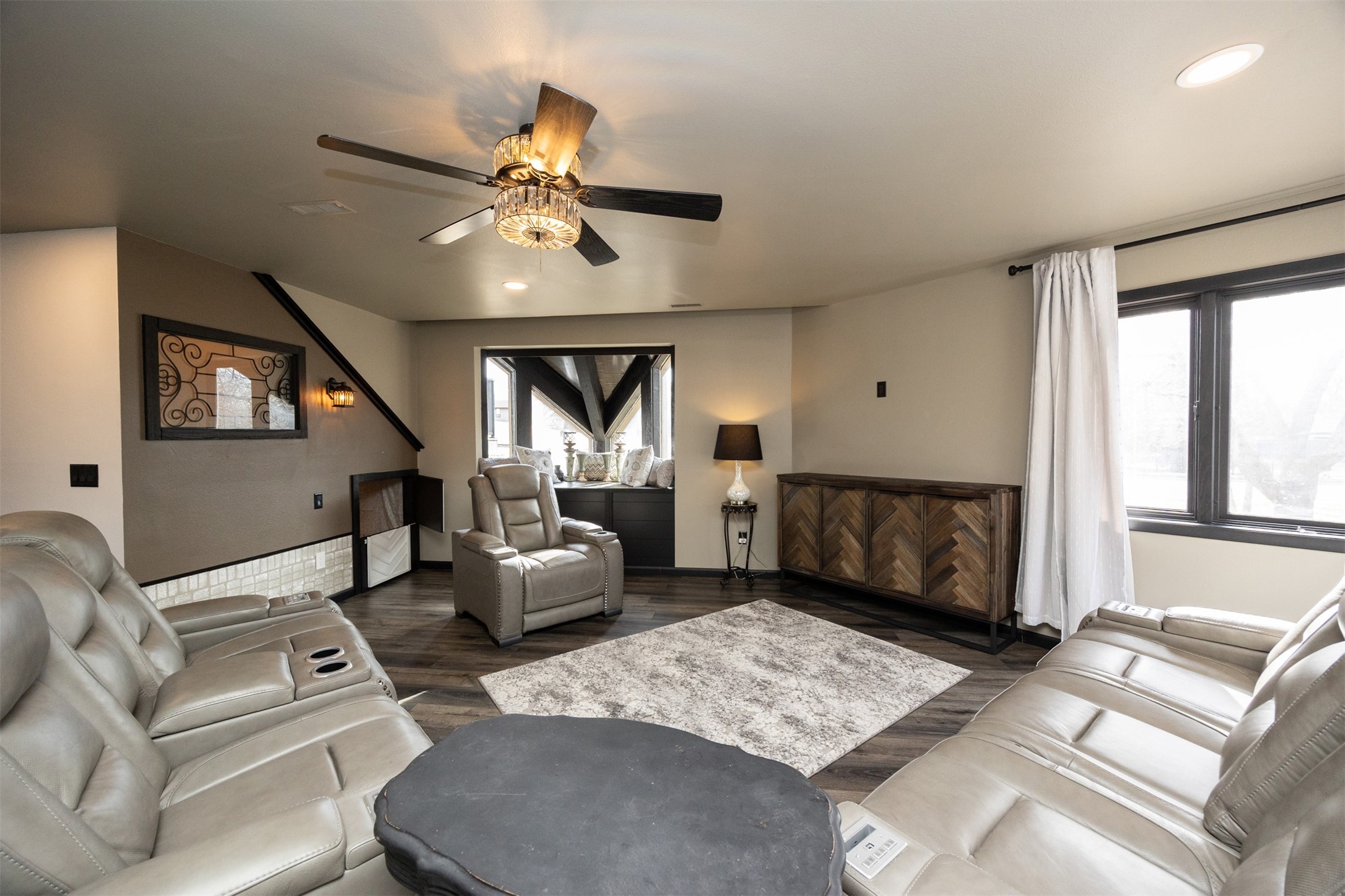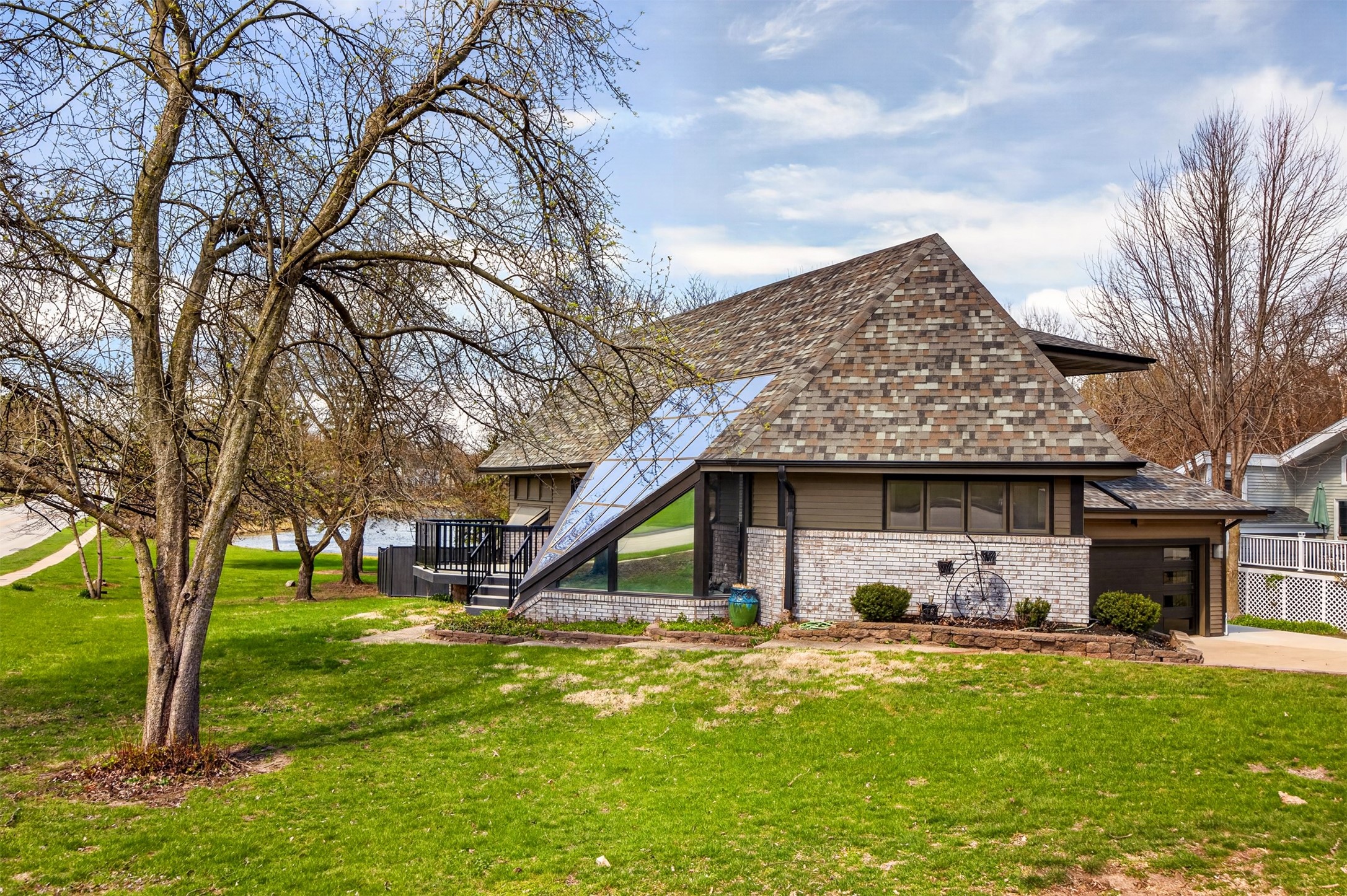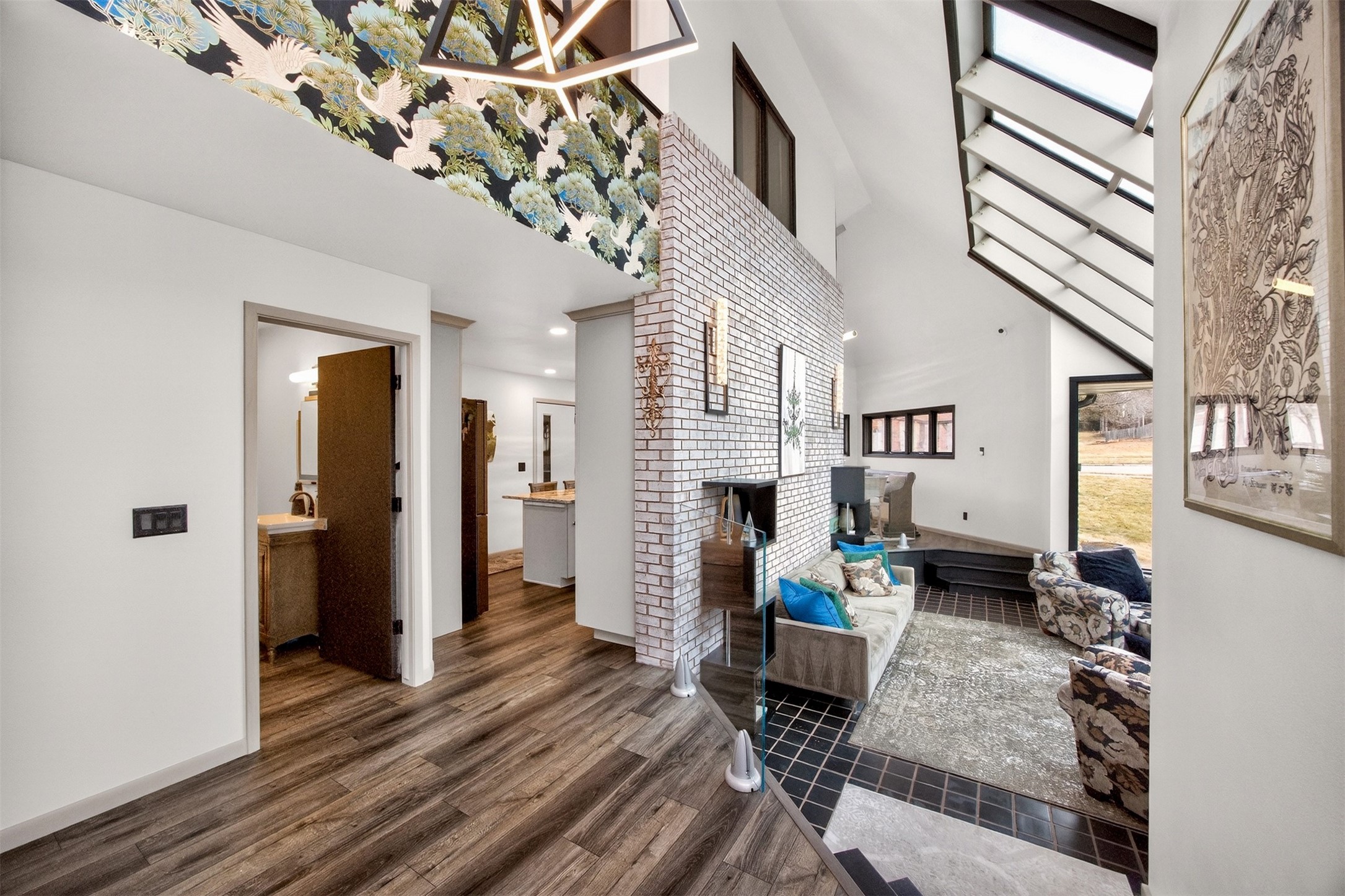 Architecturally distinctive and fully remodeled, this West Des Moines multi-level residence offers striking design just minutes from Jordan Creek and quick access to I-235/I-80. Designed to be unique, the dramatic sunken living room showcases a whitewashed brick wall and illuminated glass railings - an eye-catching focal point rarely found at this price point. The kitchen has been thoughtfully opened to create a seamless flow, featuring new cabinetry, Cambria countertops, updated appliances, and direct garage access. A dedicated dining area connects the main living spaces for easy entertaining. Upstairs, the primary suite includes a walk-in closet and beautifully finished 3/4 bath with dual vanity and statement tile shower. Bedrooms two and three function as a secondary suite with their own 3/4 bath, complete with tile shower, built-in storage, and walk-in closet - ideal for guests, multigenerational living, or a private office retreat. The lower level adds a second living area, storage room, and a hidden playroom tucked under the stairs. Additional highlights: 2-car garage with storage, new garage door, extra side parking pad, maintenance-free decks, LVP flooring, textured ceilings, updated lighting/fixtures, and roof and gutters (2023). Prime Ashworth Road location close to shopping, dining, and commuter routes. Wonderful south exposure for lots of natural light!