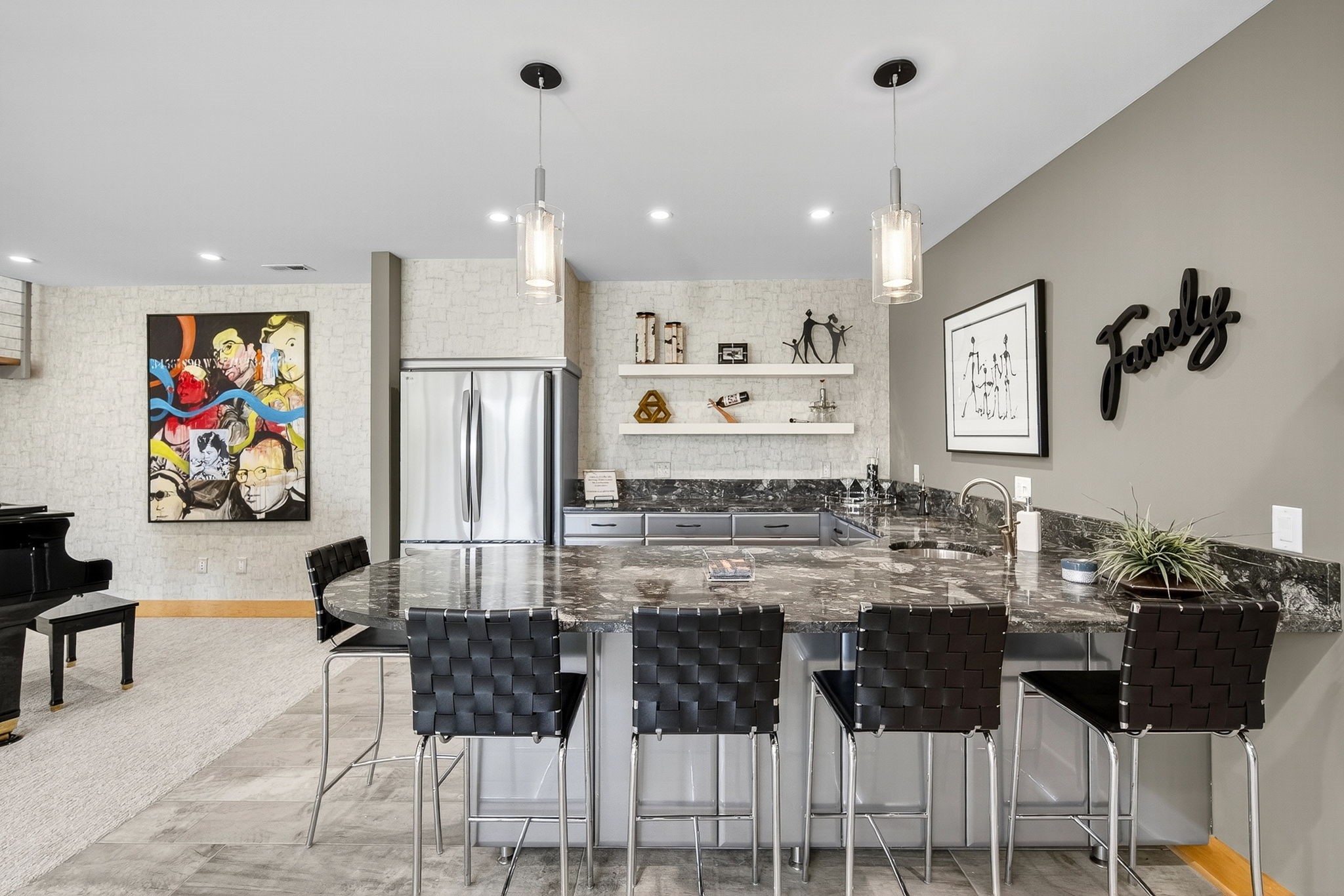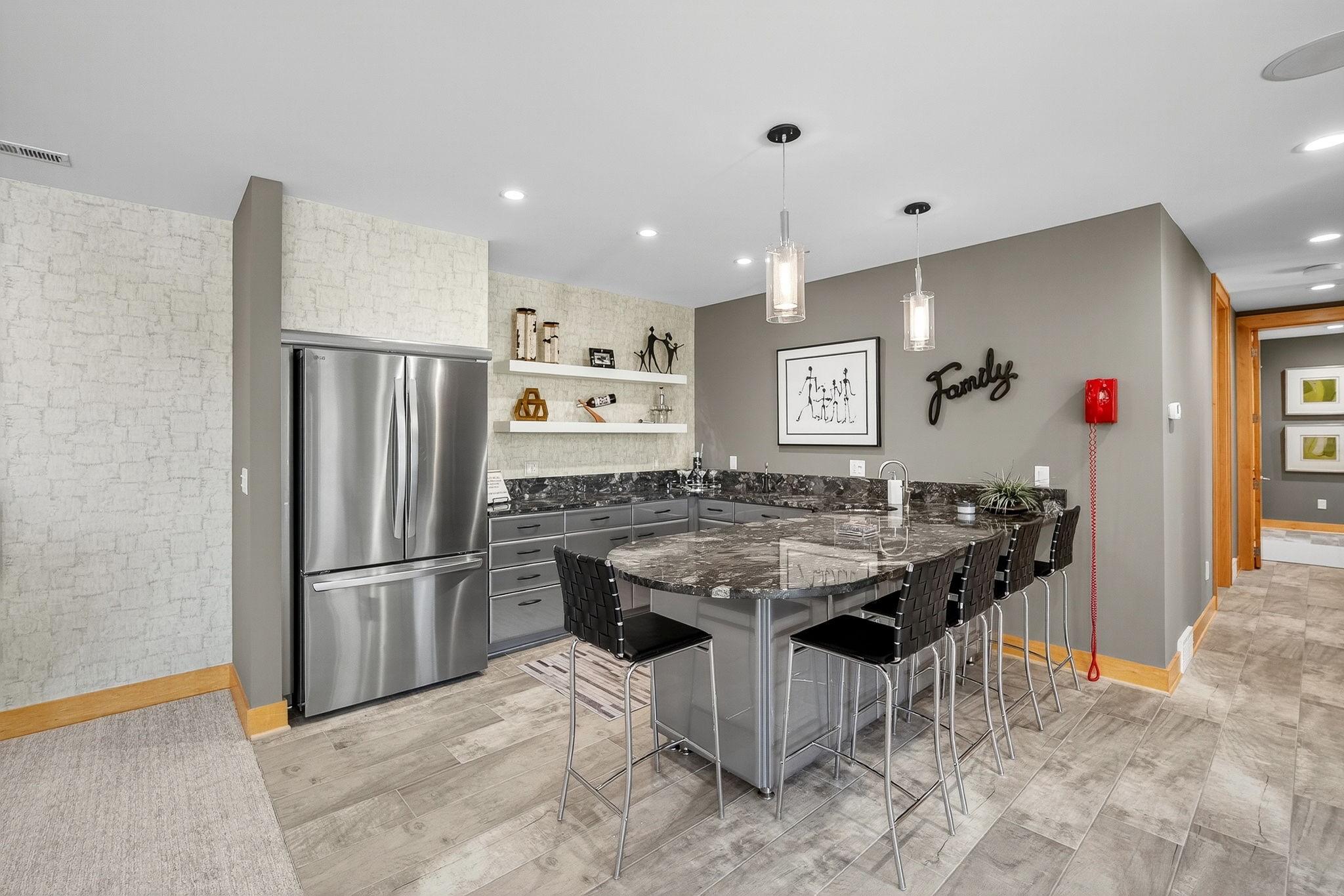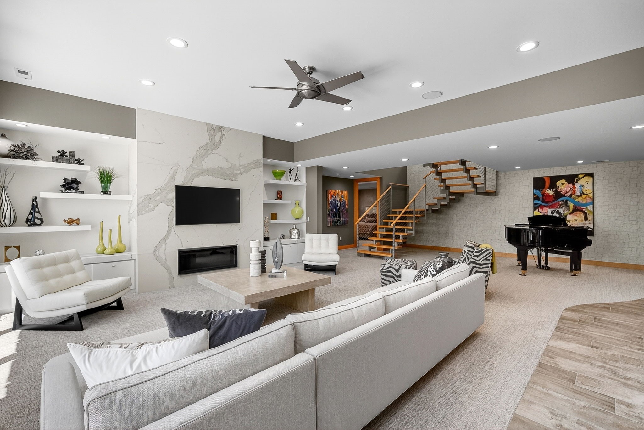 The lower level continues the luxury with a large entertainment room, gas fireplace, and full bar. Three generously sized bedrooms with oversized closets, two stylish 3/4 baths, and a dedicated office offer flexible living. A tucked-under garage adds convenience.