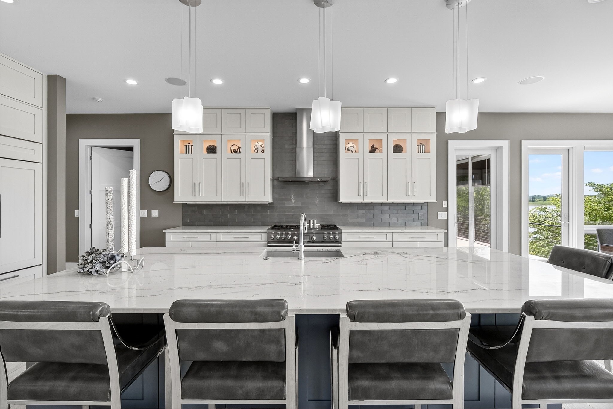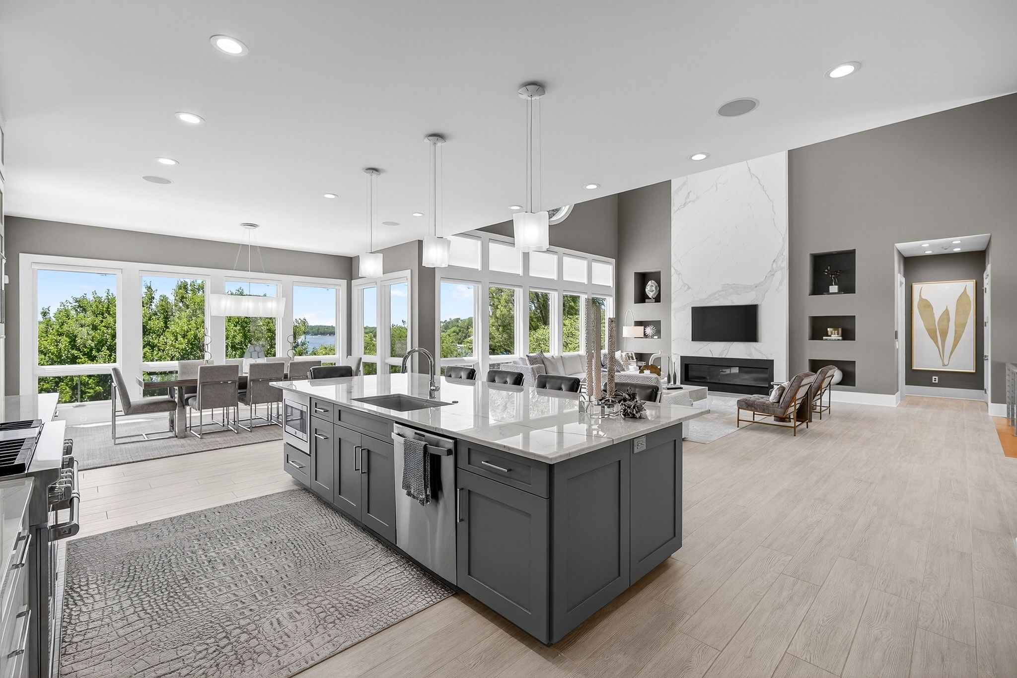 This extraordinary lakefront residence is perfectly positioned on the Main Basin of Lake Panorama and offers breathtaking views, timeless architecture, and exceptional craftsmanship. A wall of windows captures panoramic lake vistas and fills the open-concept great room with natural light. Soaring ceilings and a dramatic floor-to-ceiling quartzite gas fireplace create a warm, elegant focal point.
