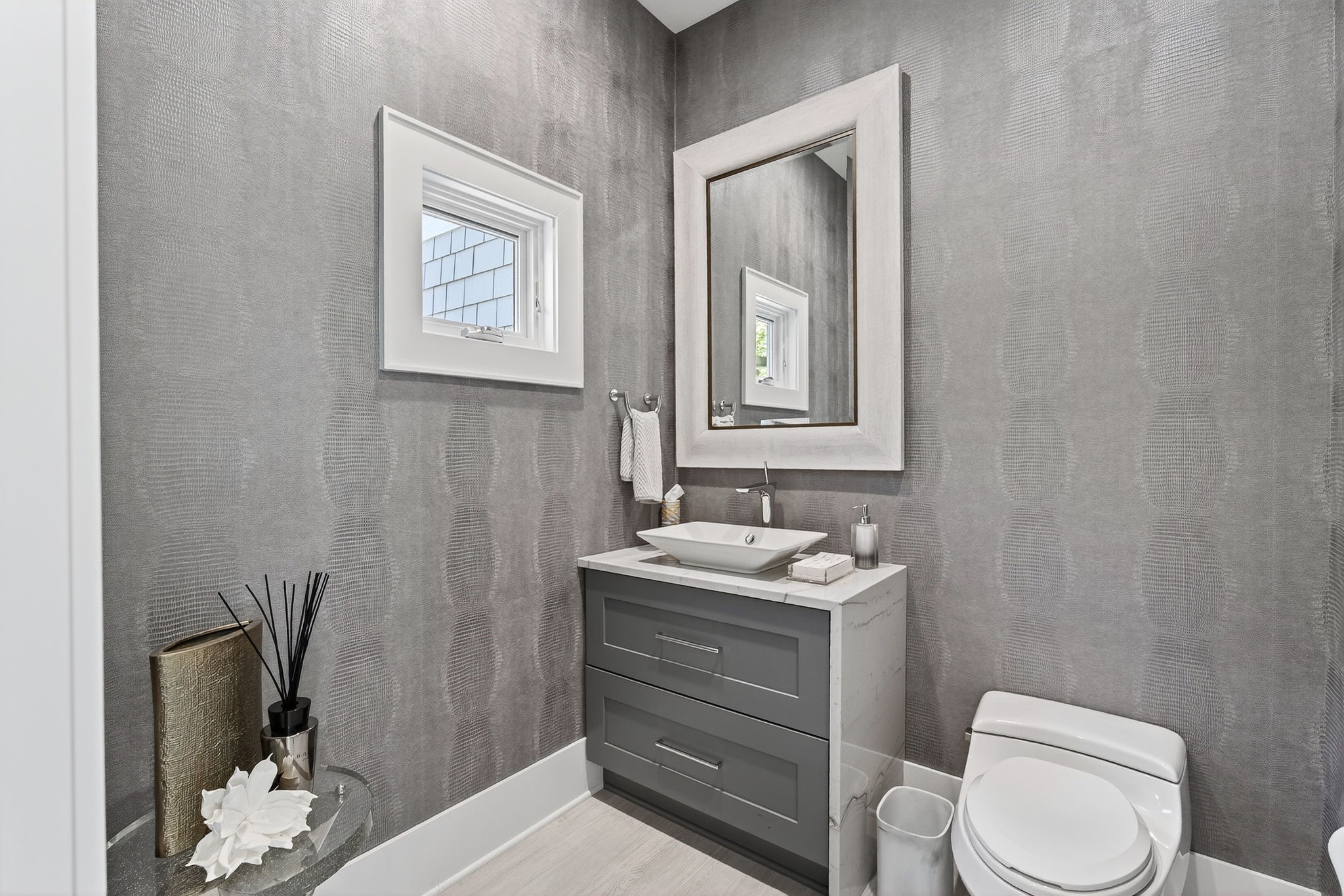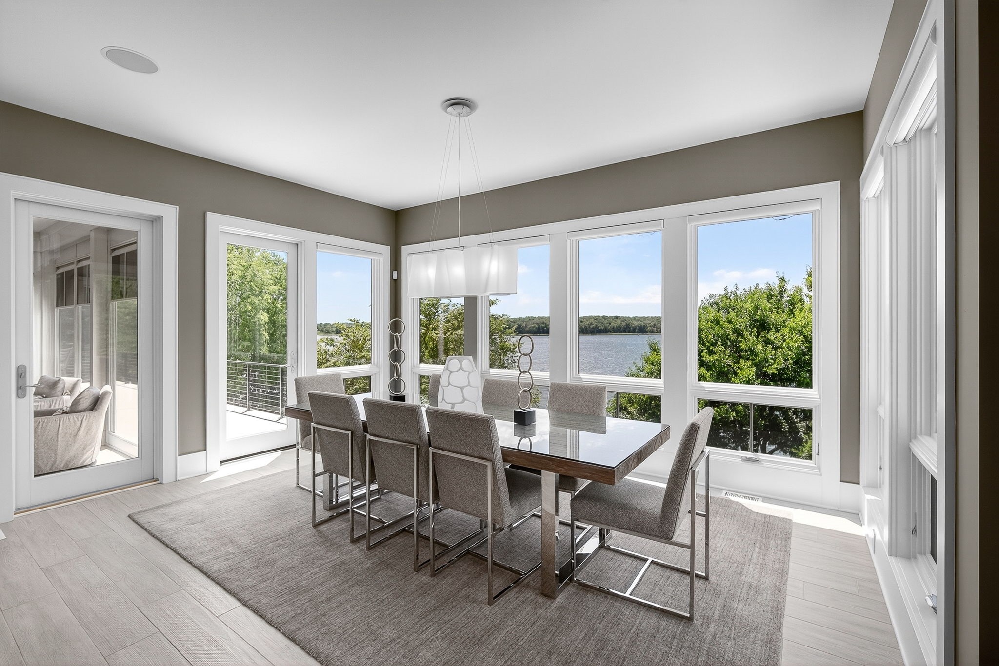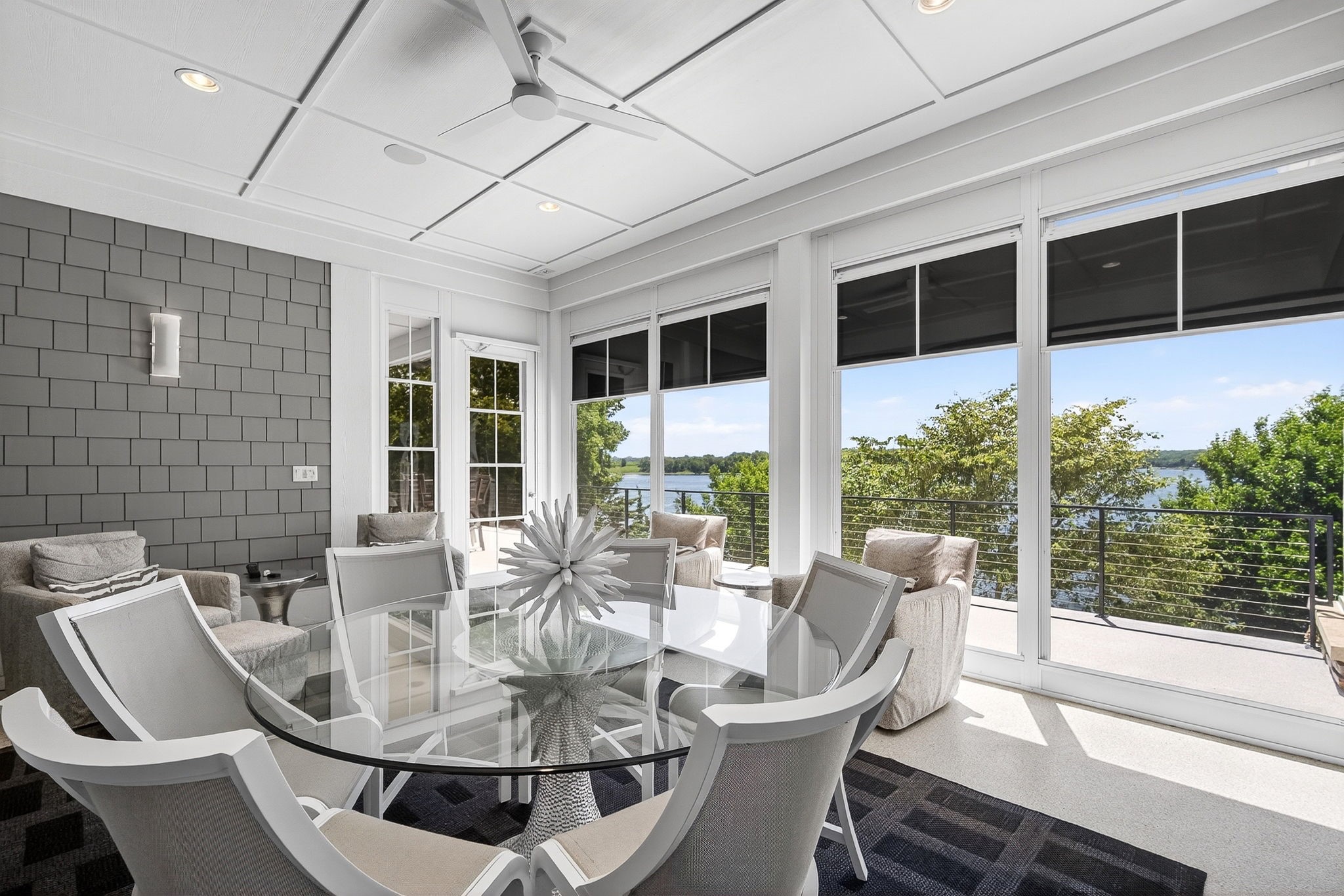 The chef's kitchen features high-end appliances, a large quartzite island, and a walk-in pantry with prep sink. The adjoining dining area and screened-in porch offer perfect spaces for entertaining or unwinding while overlooking the water.