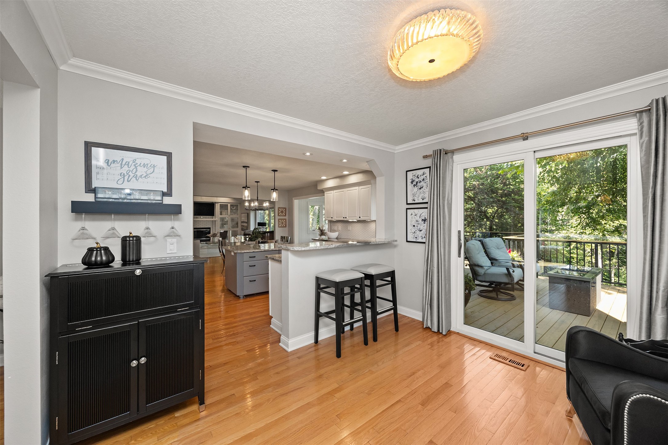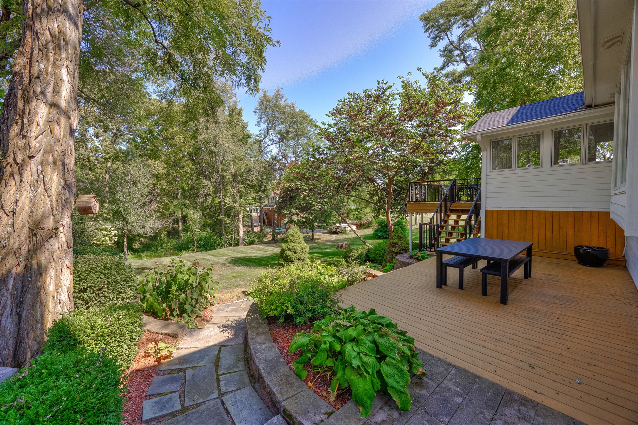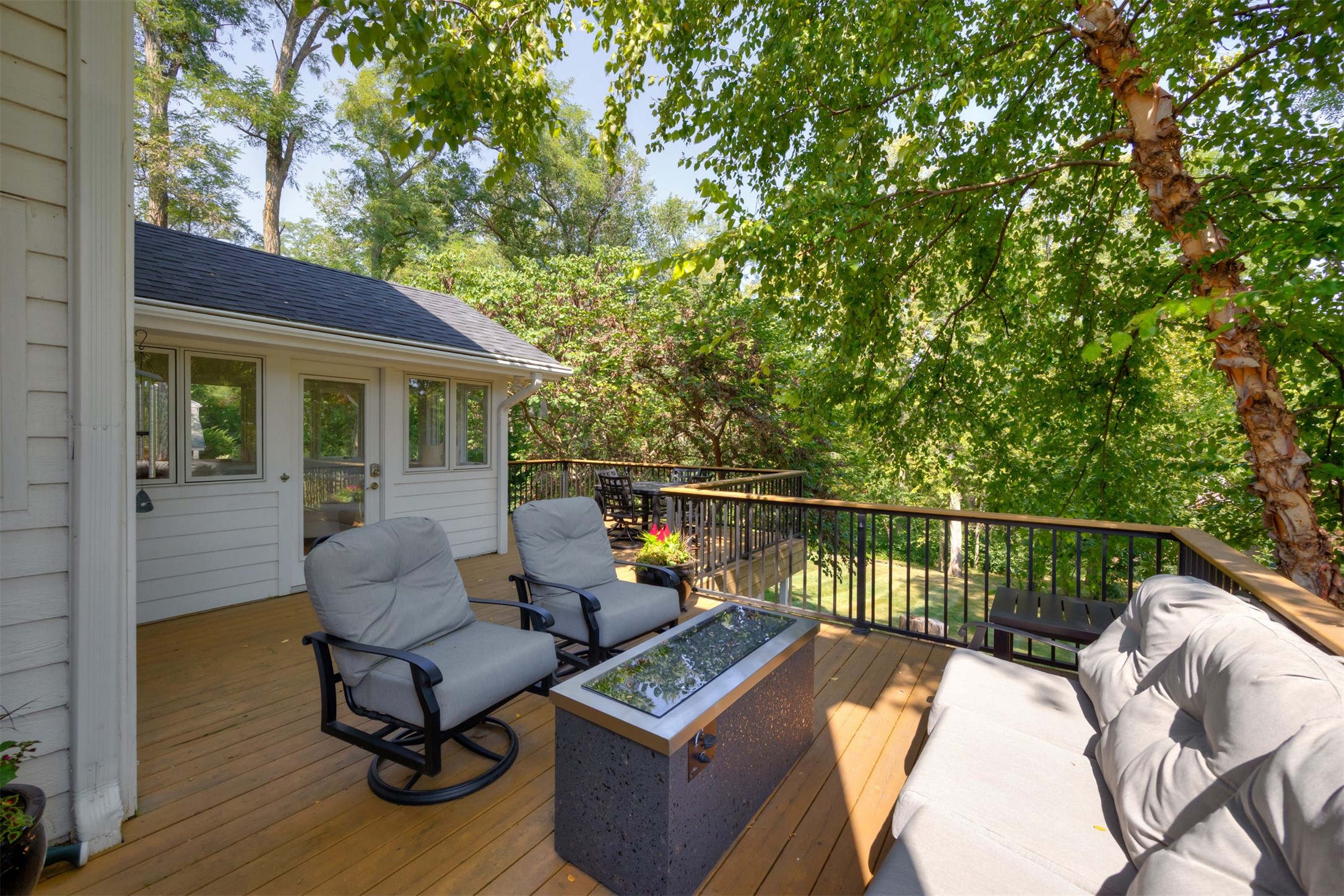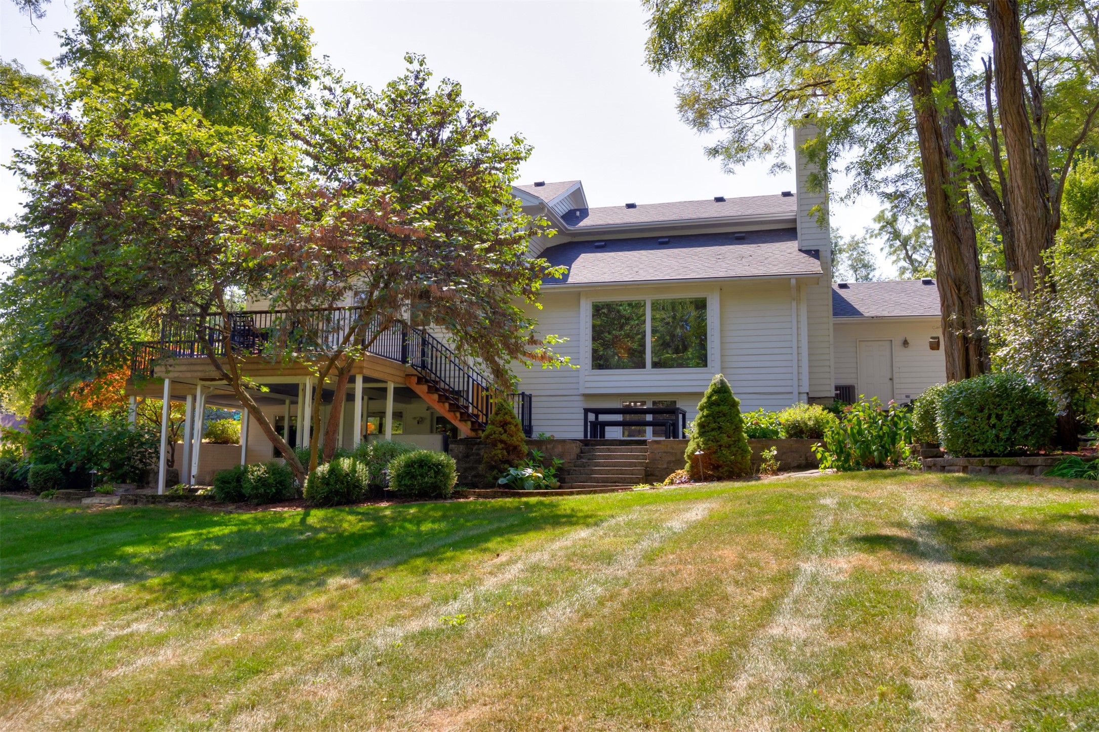 A stunning, fully renovated two-story home tucked away on nearly half an acre in Johnston! Originally built in 1991, every detail inside & out has been updated to create a move-in ready retreat surrounded by mature trees, lush landscaping, uplighting, and a backyard designed for entertaining with a firepit, patio + hot tub. Inside, hardwood floors flow throughout the main level where you'll find a stylish half bath, dining/flex room, and a seller-favorite, the "bourbon room." The kitchen features granite countertops, updated cabinetry, tile backsplash, and an adjoining sunroom and eat-in area. The vaulted living room impresses w/ floor-to-ceiling picture windows, built-ins, and cozy gas fireplace. Upstairs, the expansive primary suite includes hardwood floors, a sitting area, built-ins for added storage, a large walk-in closet, and a spa-inspired bath w/ soaking tub + tiled shower. Three add'l bedrooms, full bath + laundry complete the upper level. The finished walkout lower level adds even more living space with a third fireplace, custom built-ins, a cedar closet (perfect for storage or future sauna), and a daylight area that could serve as a 5th bedroom. Practical updates incl newer HVAC, roof, and windows. The oversized garage w/ epoxy floors offers ample storage and room for a locker system. Set in a private location near trails, recreation, and Saylorville Lake, this property blends thoughtful design, modern updates, and a serene setting--an ideal place to call home.