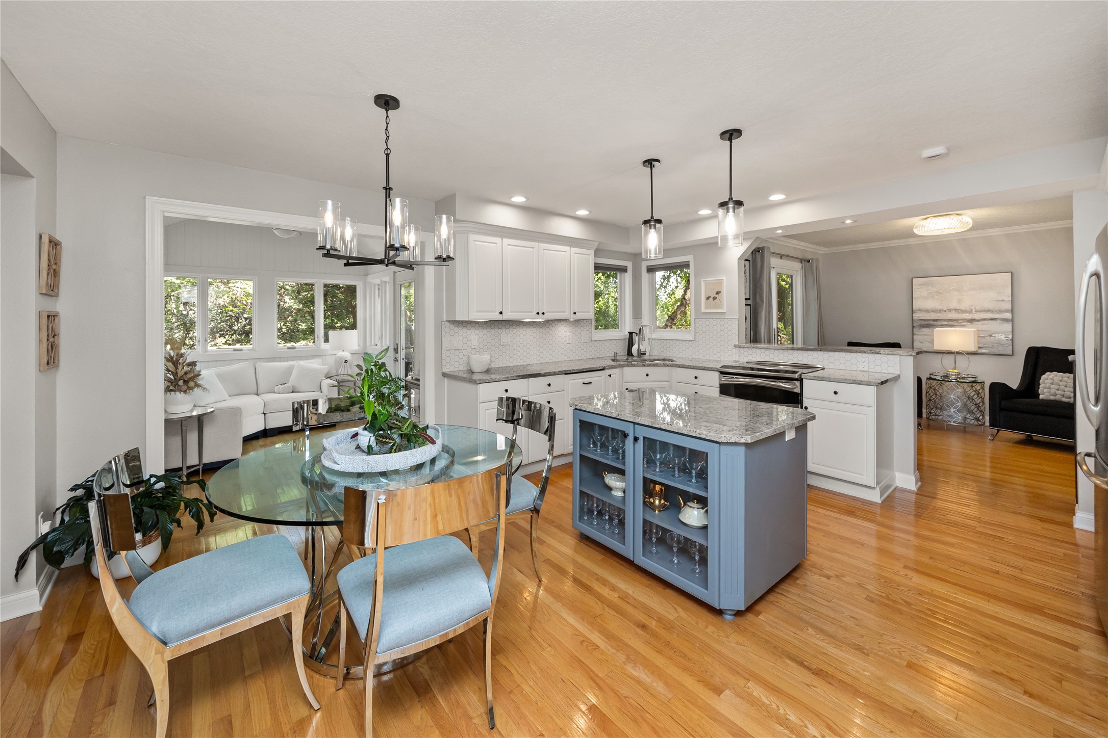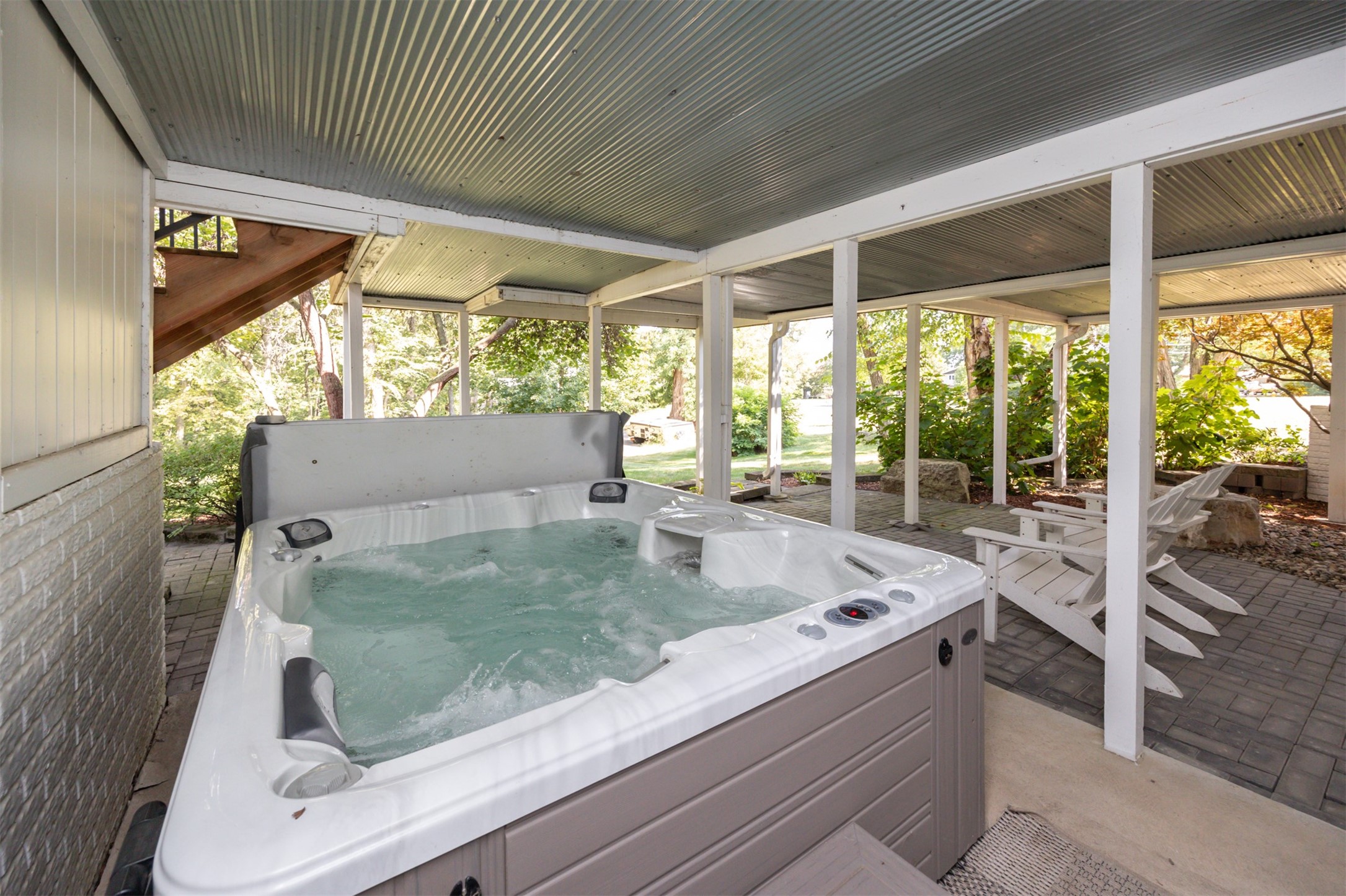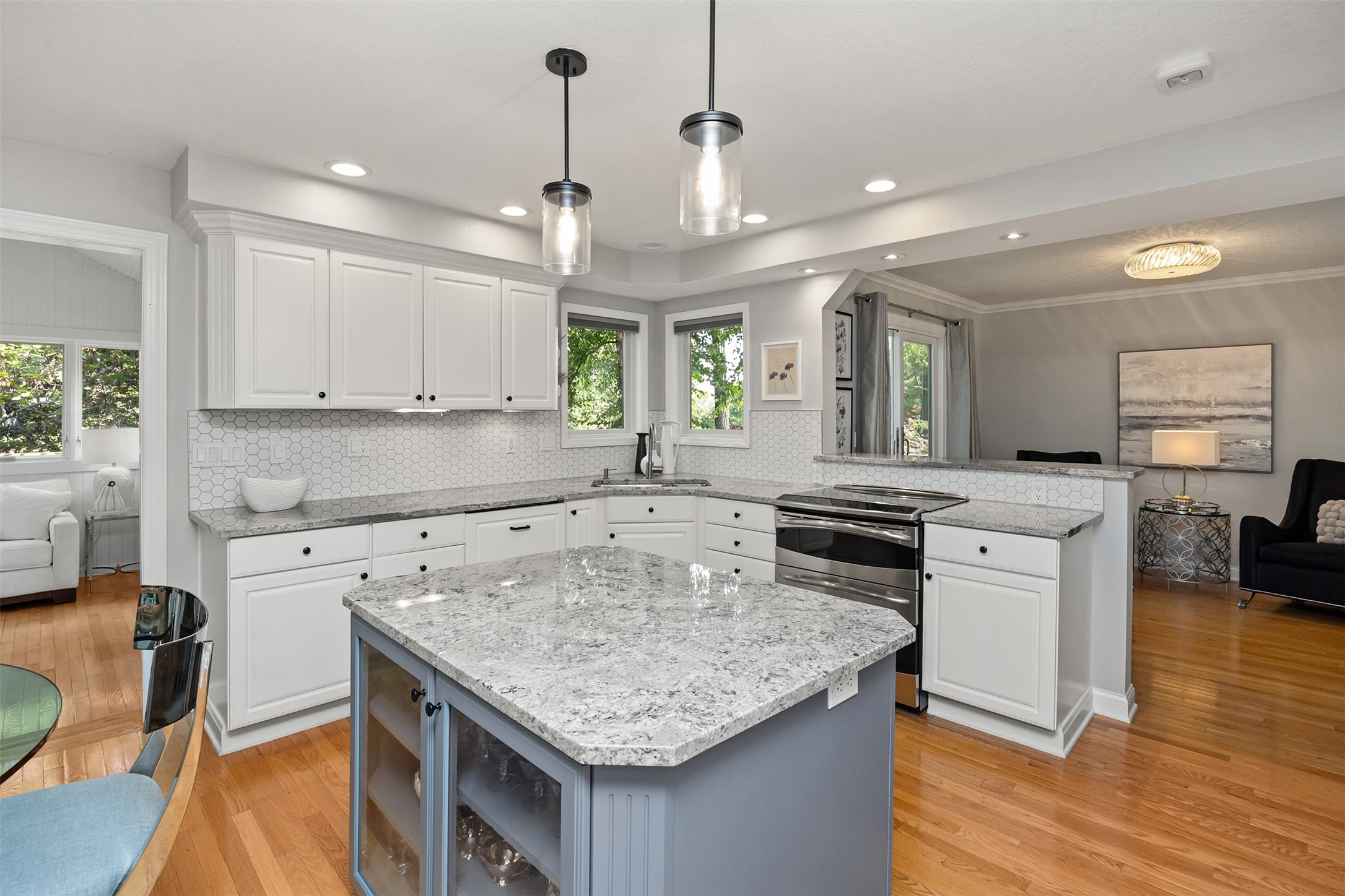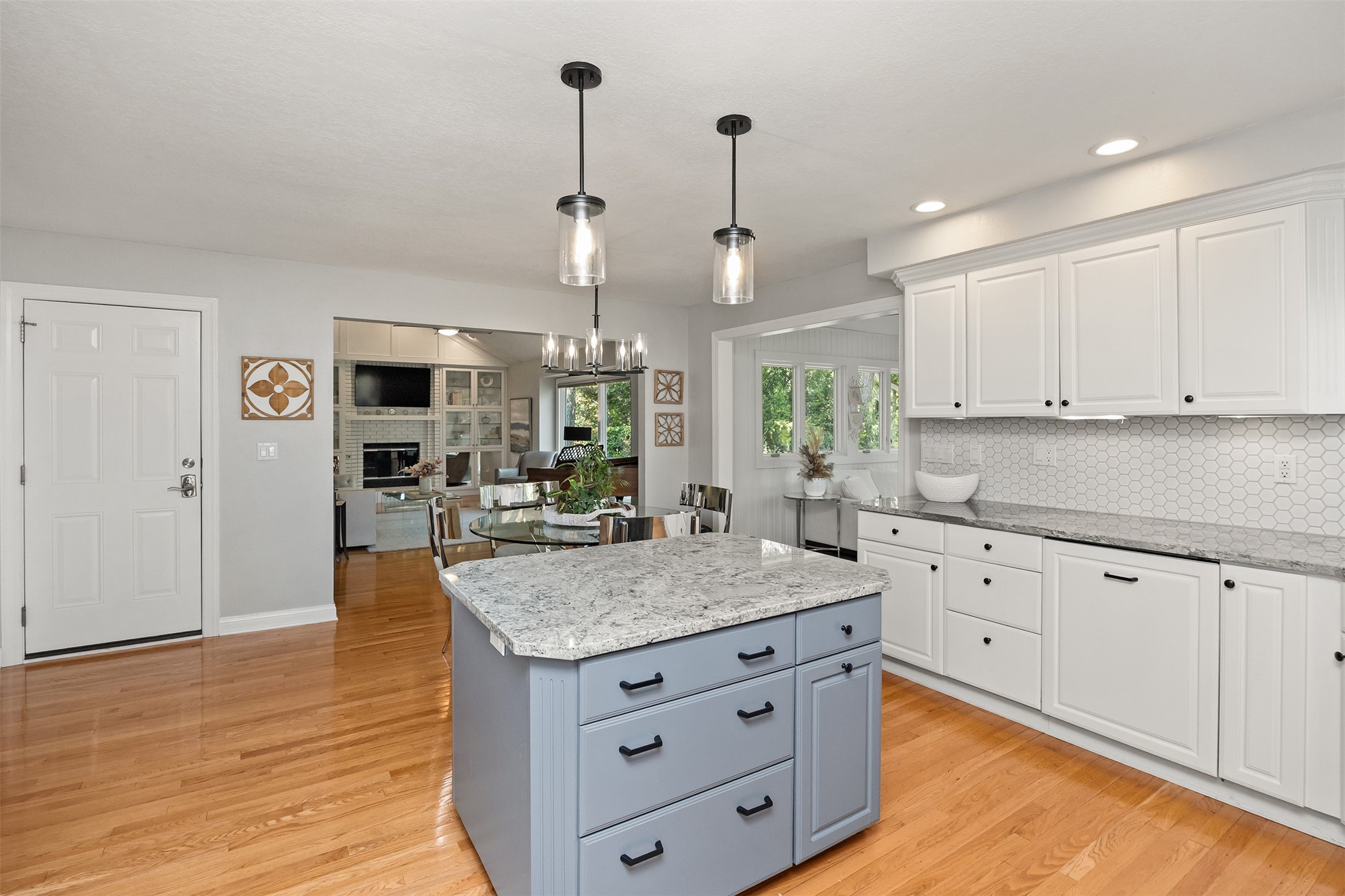 A stunning, fully renovated two-story home tucked away on nearly half an acre in Johnston! Originally built in 1991, every detail inside & out has been updated to create a move-in ready retreat surrounded by mature trees, lush landscaping, uplighting, and a backyard designed for entertaining with a firepit, patio + hot tub. Inside, hardwood floors flow throughout the main level where you'll find a stylish half bath, dining/flex room, and a seller-favorite, the "bourbon room." The kitchen features granite countertops, updated cabinetry, tile backsplash, and an adjoining sunroom and eat-in area. The vaulted living room impresses w/ floor-to-ceiling picture windows, built-ins, and cozy gas fireplace. Upstairs, the expansive primary suite includes hardwood floors, a sitting area, built-ins for added storage, a large walk-in closet, and a spa-inspired bath w/ soaking tub + tiled shower. Three add'l bedrooms, full bath + laundry complete the upper level. The finished walkout lower level adds even more living space with a third fireplace, custom built-ins, a cedar closet (perfect for storage or future sauna), and a daylight area that could serve as a 5th bedroom. Practical updates incl newer HVAC, roof, and windows. The oversized garage w/ epoxy floors offers ample storage and room for a locker system. Set in a private location near trails, recreation, and Saylorville Lake, this property blends thoughtful design, modern updates, and a serene setting--an ideal place to call home.