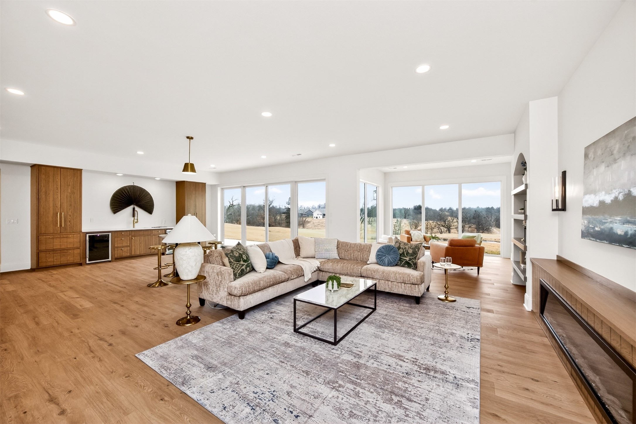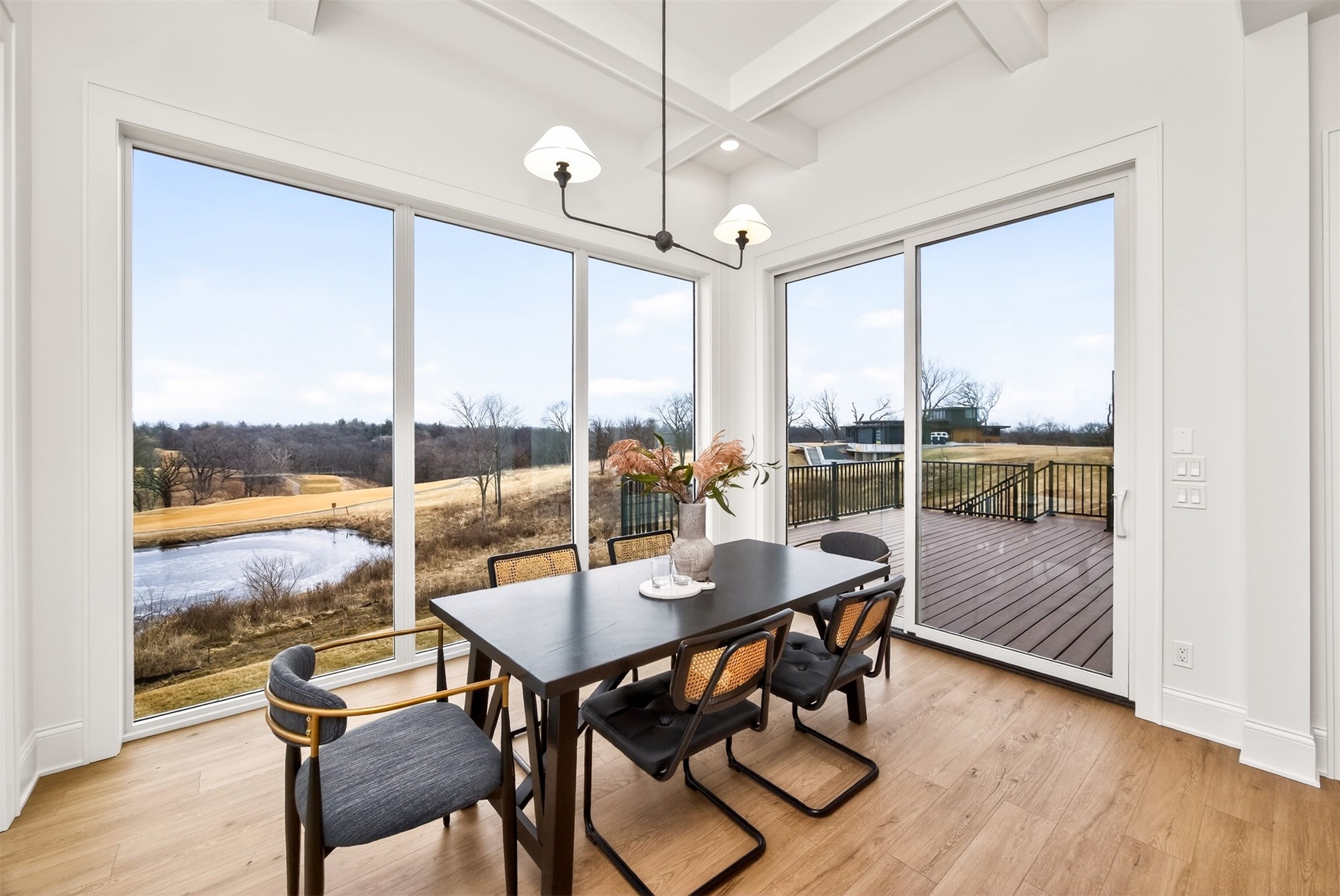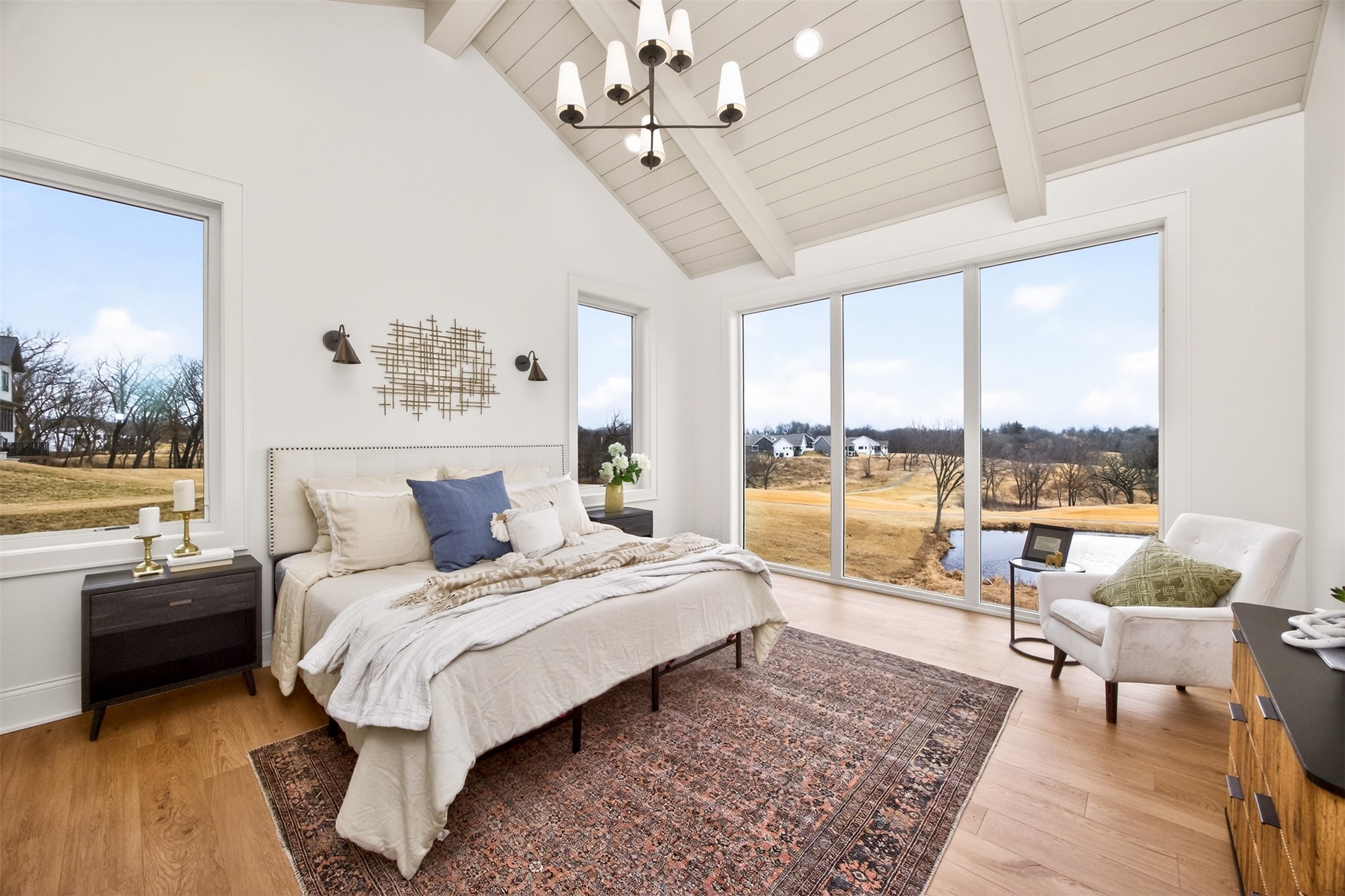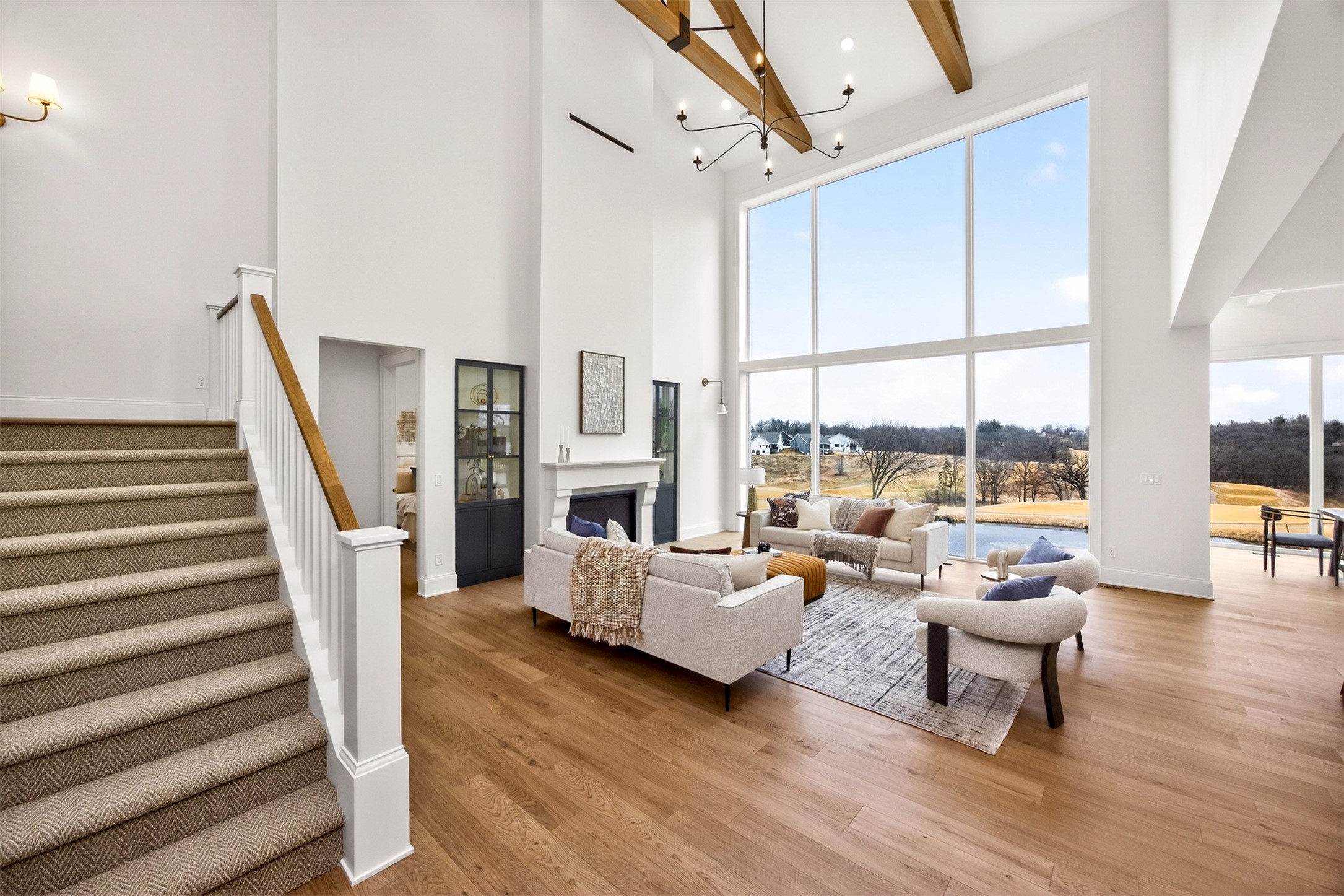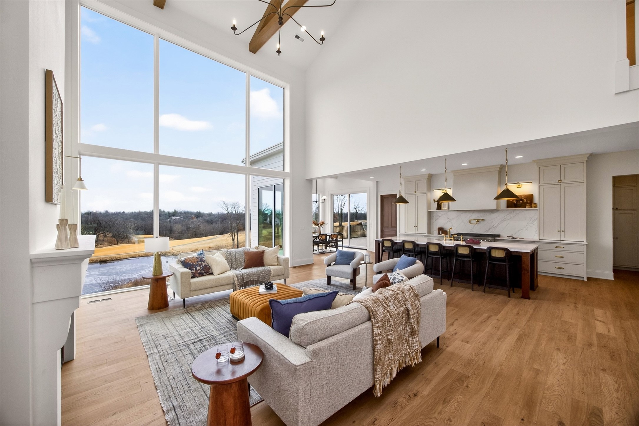 Wake to fairway views and end the day under wide Iowa skies. Perfectly placed on 1.27 acres along the 15th hole at Bos Landen, this coastal-inspired farmhouse offers privacy, architectural character, and the rare freedom of no HOA. A dramatic 27' vaulted great room with exposed trusses, cast stone fireplace, and walls of Pella Impervia windows frames rolling greens and pond views. Restored antique pocket doors add warmth and provenance. The kitchen is built for gathering - quartz surfaces, unlacquered brass fixtures, dual-fuel range with pot filler, premium appliances, and a walk-in pantry with butcher block prep space and grocery pass-through to the garage. Composite decking extends entertaining outdoors, and the yard is already plumbed for a future 20x30 pool. With 5 bedrooms and 4.5 baths (including a private mother-in-law suite) this home lives large. The vaulted primary retreat features integrated lighting controls, while the walkout lower level offers 10' ceilings, 8' sliders, wet bar, and 84" linear fireplace. Dual-zone geo HVAC, EV charging, and tuck-under garage complete this refined retreat. Just minutes from downtown Pella, Lake Red Rock, and the Pella Municipal Airport, this setting offers both everyday convenience and effortless travel access with a quick commute to DSM. Large, thoughtfully designed spaces provide flexibility for work, wellness, and multi-generational living, all while maintaining a refined, cohesive aesthetic throughout.