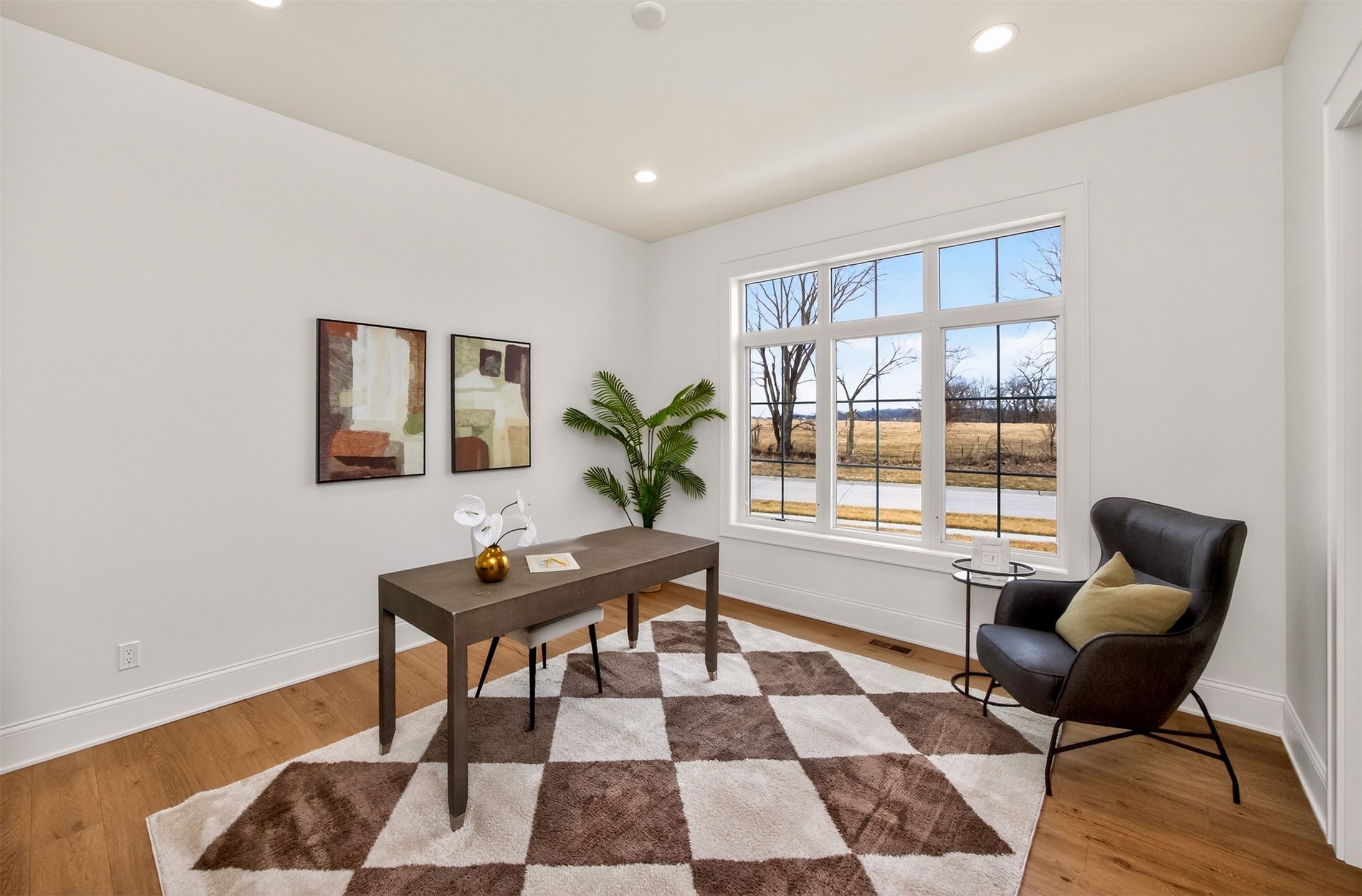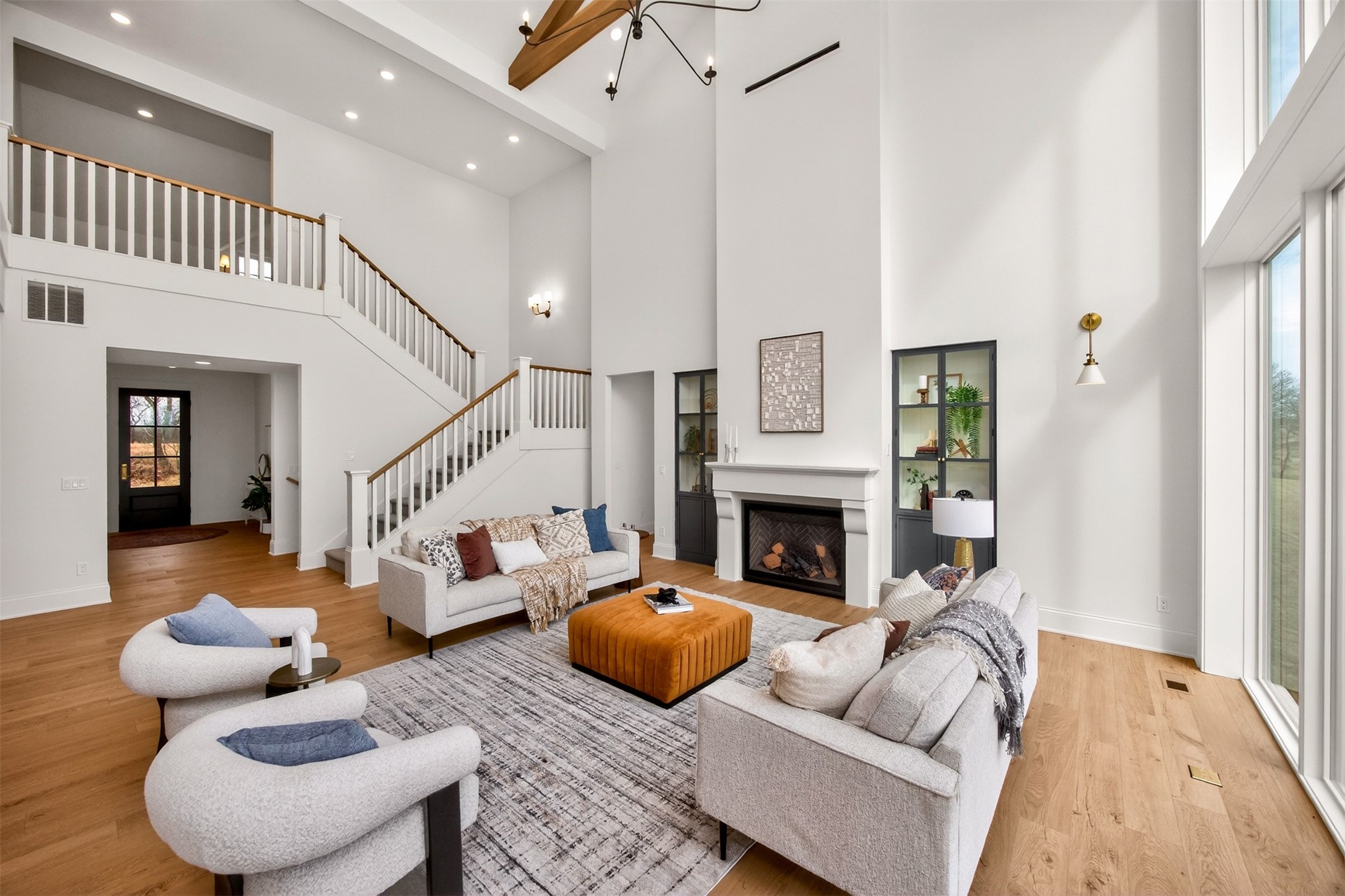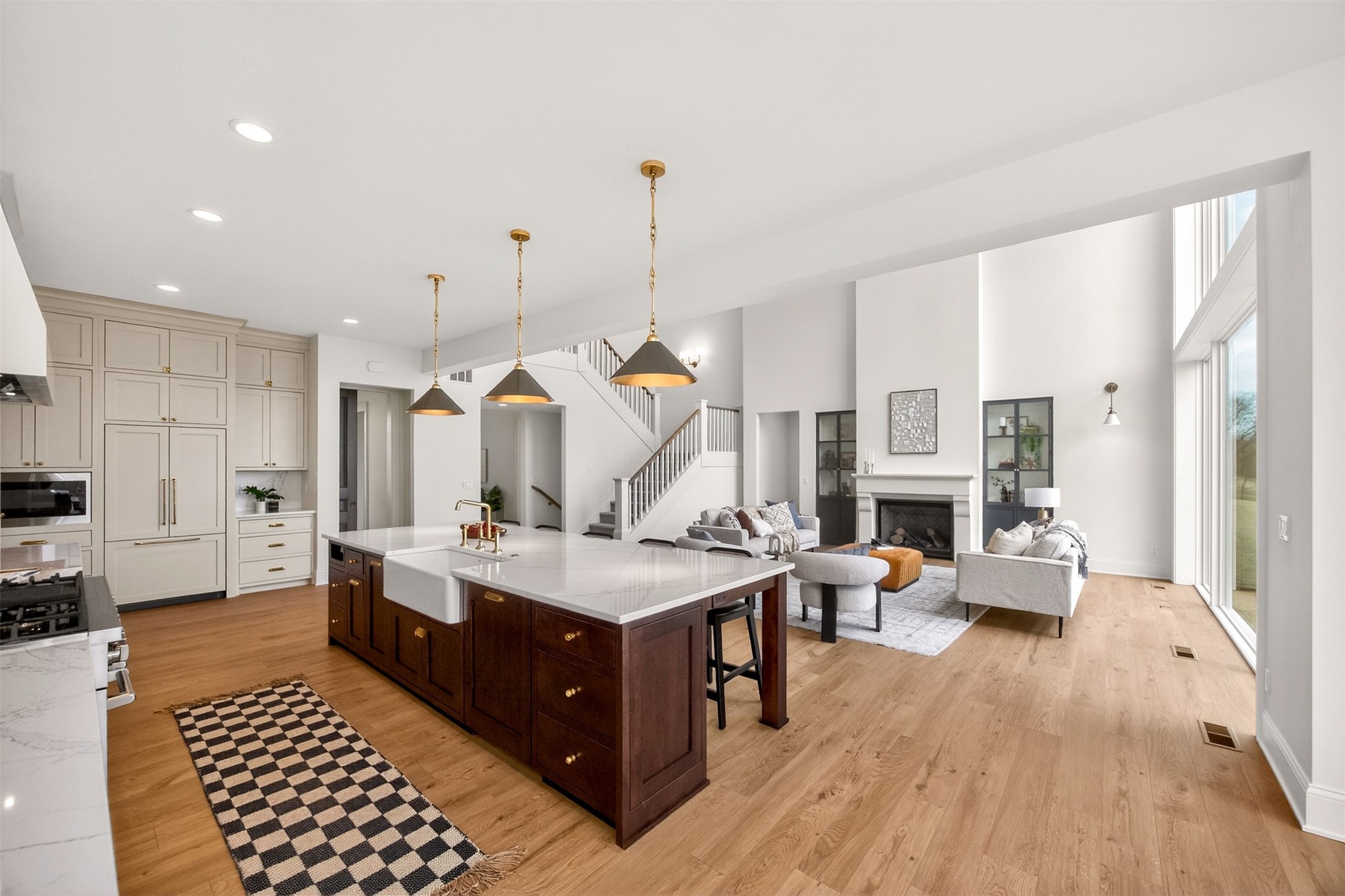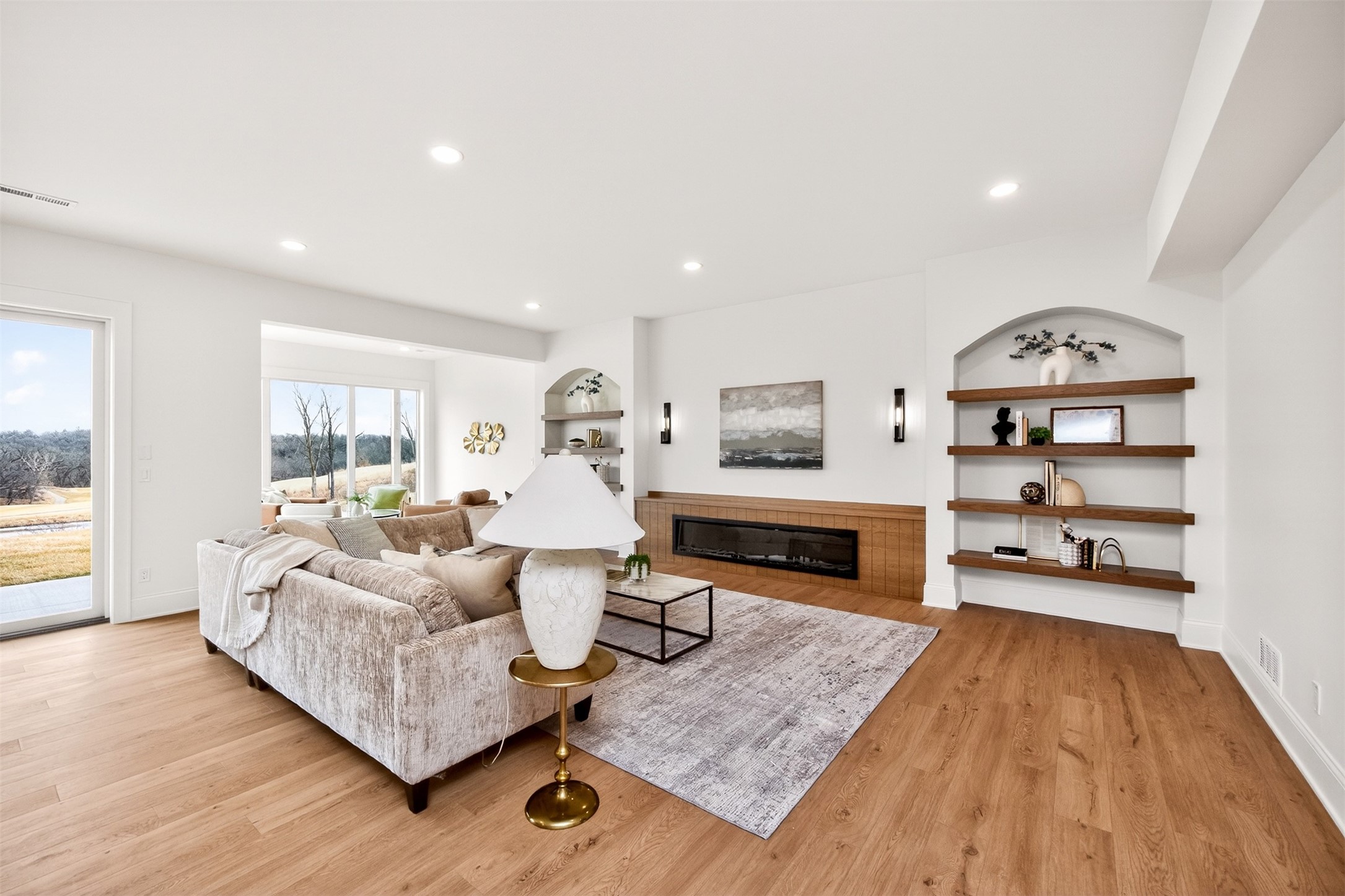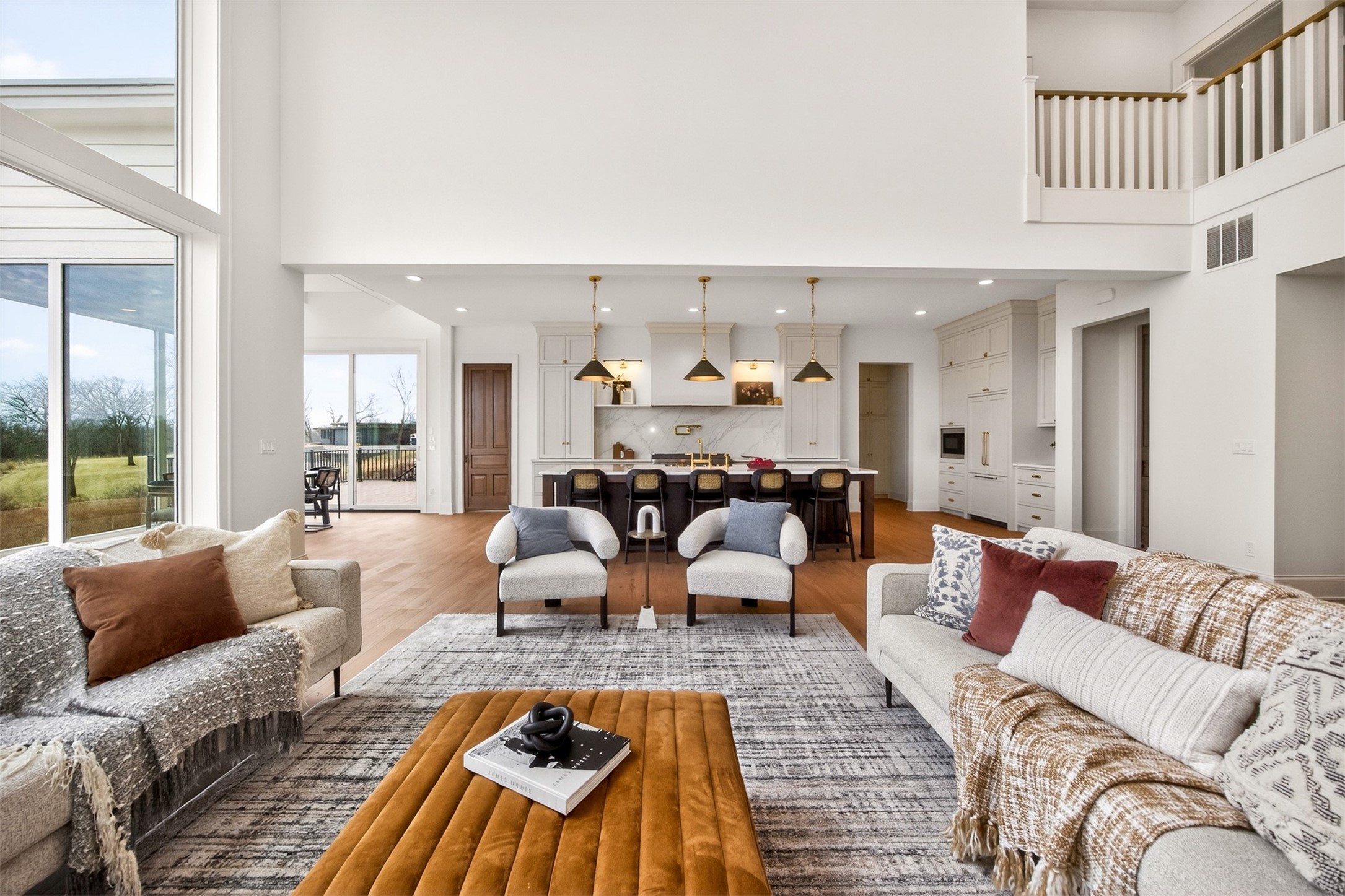 Wake to fairway views and end the day under wide Iowa skies. Perfectly placed on 1.27 acres along the 15th hole at Bos Landen, this coastal-inspired farmhouse offers privacy, architectural character, and the rare freedom of no HOA. A dramatic 27' vaulted great room with exposed trusses, cast stone fireplace, and walls of Pella Impervia windows frames rolling greens and pond views. Restored antique pocket doors add warmth and provenance. The kitchen is built for gathering - quartz surfaces, unlacquered brass fixtures, dual-fuel range with pot filler, premium appliances, and a walk-in pantry with butcher block prep space and grocery pass-through to the garage. Composite decking extends entertaining outdoors, and the yard is already plumbed for a future 20x30 pool. With 5 bedrooms and 4.5 baths (including a private mother-in-law suite) this home lives large. The vaulted primary retreat features integrated lighting controls, while the walkout lower level offers 10' ceilings, 8' sliders, wet bar, and 84" linear fireplace. Dual-zone geo HVAC, EV charging, and tuck-under garage complete this refined retreat. Just minutes from downtown Pella, Lake Red Rock, and the Pella Municipal Airport, this setting offers both everyday convenience and effortless travel access with a quick commute to DSM. Large, thoughtfully designed spaces provide flexibility for work, wellness, and multi-generational living, all while maintaining a refined, cohesive aesthetic throughout.